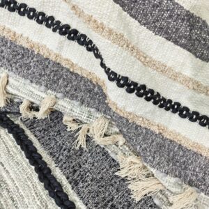 - Rich Texture and Pattern: A captivating mix of neutral tones—cream, beige, charcoal, and black—are arranged in bold stripes and intricate weave patterns, including distinctive tufted accents and stitched detailing.