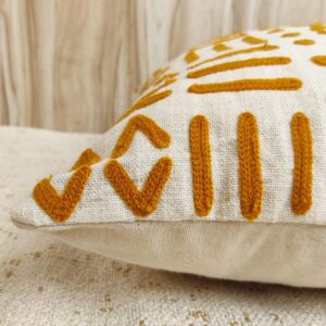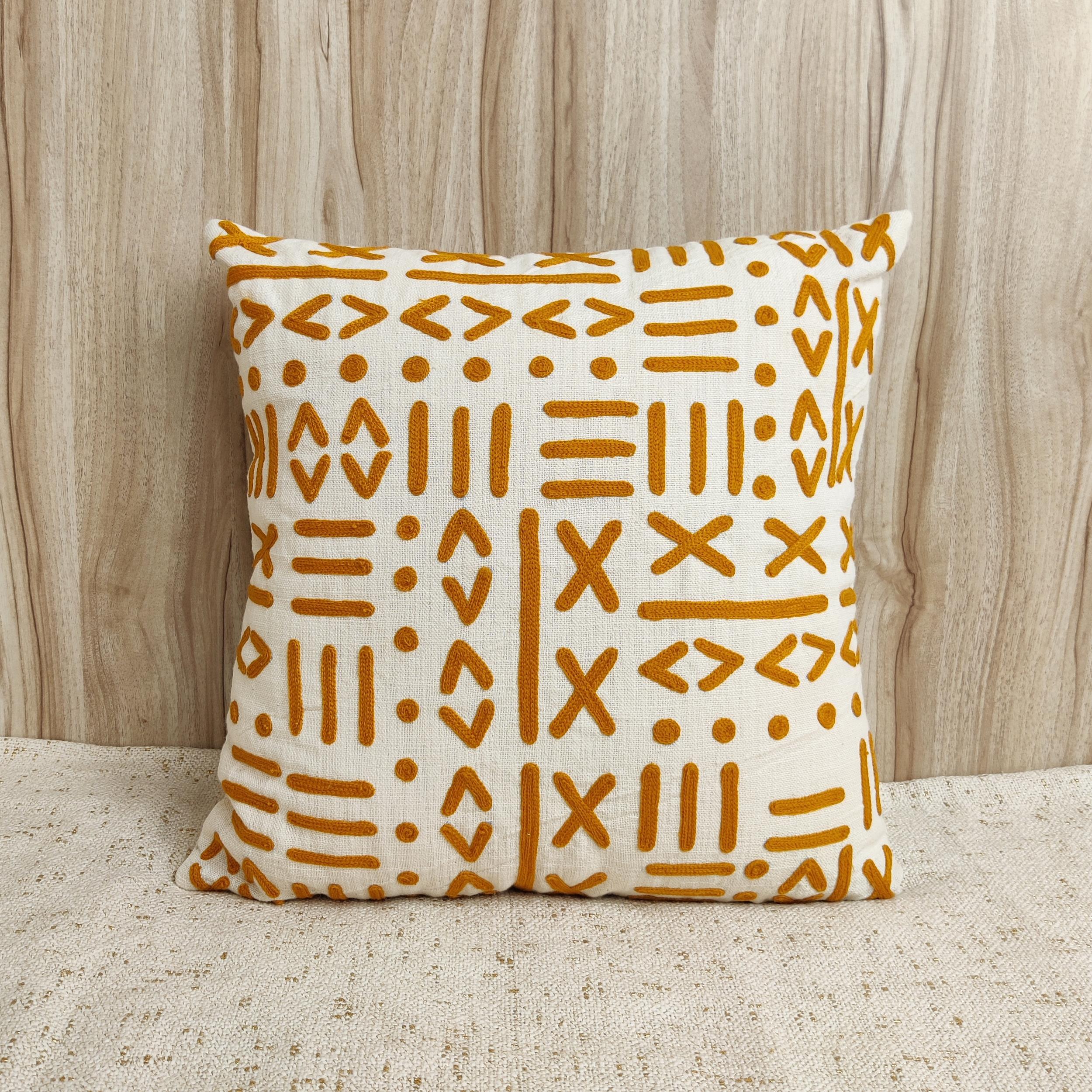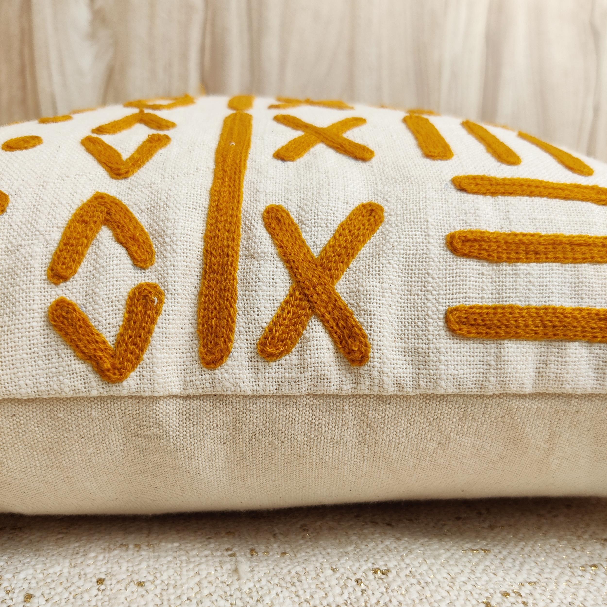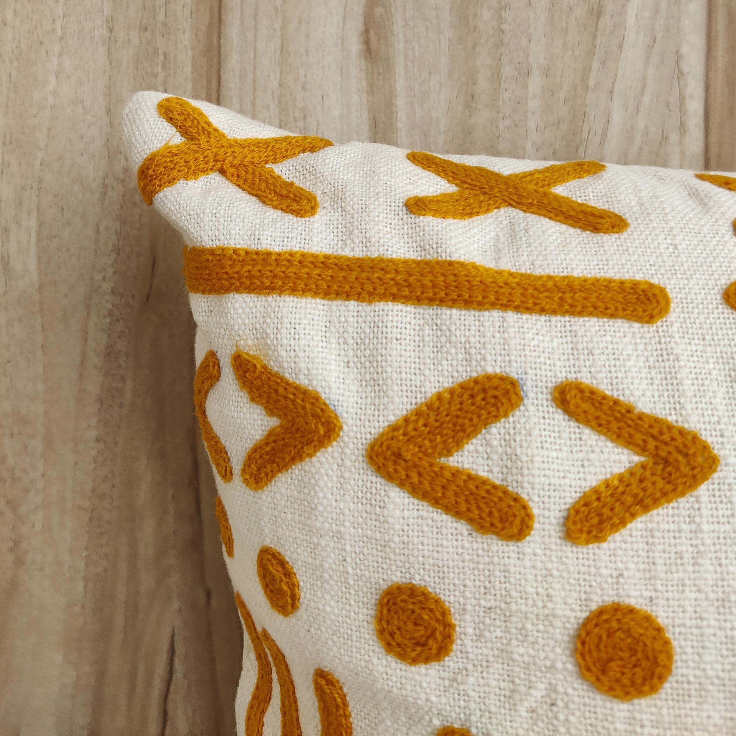 The cover features a beautiful base of natural cotton slub fabric in a soft cream hue, which provides an organic, tactile backdrop. The intricate geometric patterns—a sophisticated mosaic of dashes, diamonds, and crosses—are meticulously hand-embroidered with soft, burnt ochre (mustard-gold) acrylic wool.