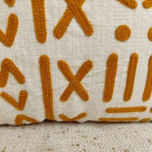 Define your space with the captivating geometry and rich texture of the ‘Ochre Mudcloth’ Cushion Cover. This stunning piece draws inspiration from traditional global textiles, offering an authentic, handcrafted flair.