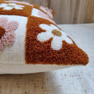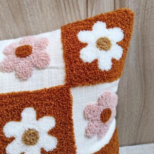 - Groovy Floral Design: Features sweet, hand-embroidered daisy-like flowers in soft pink and creamy white, set against a chic checkerboard of rich terracotta/brown and crisp white.