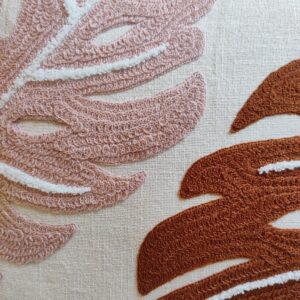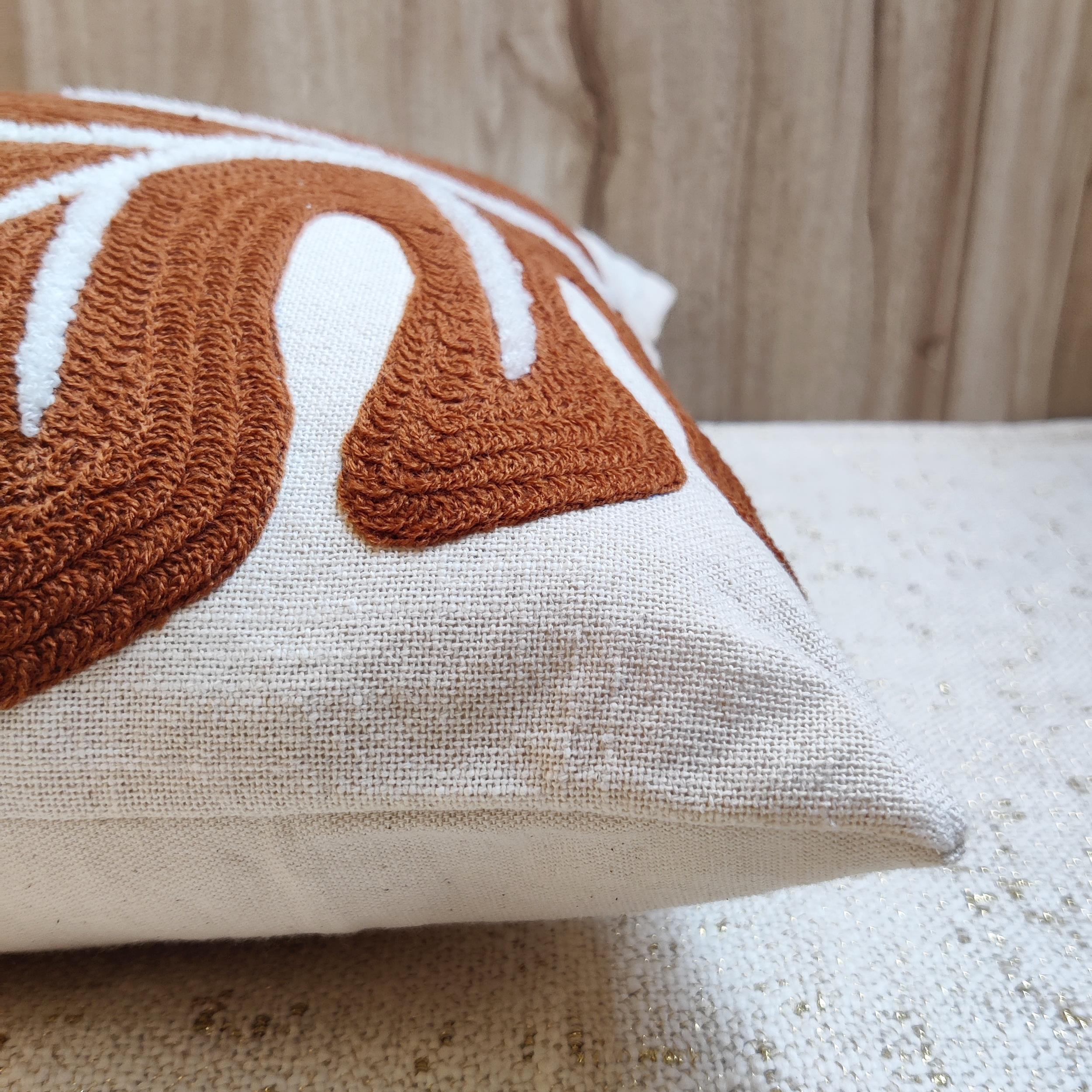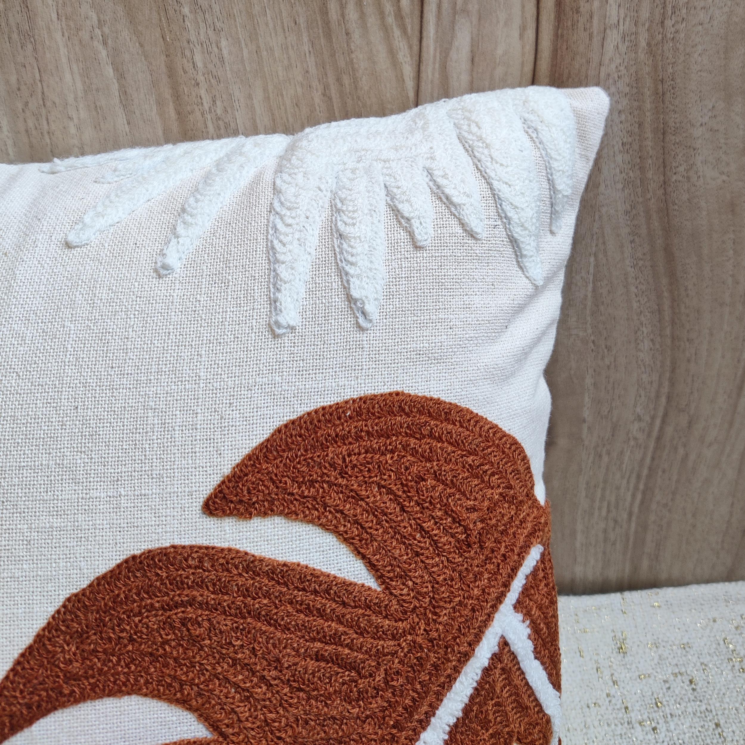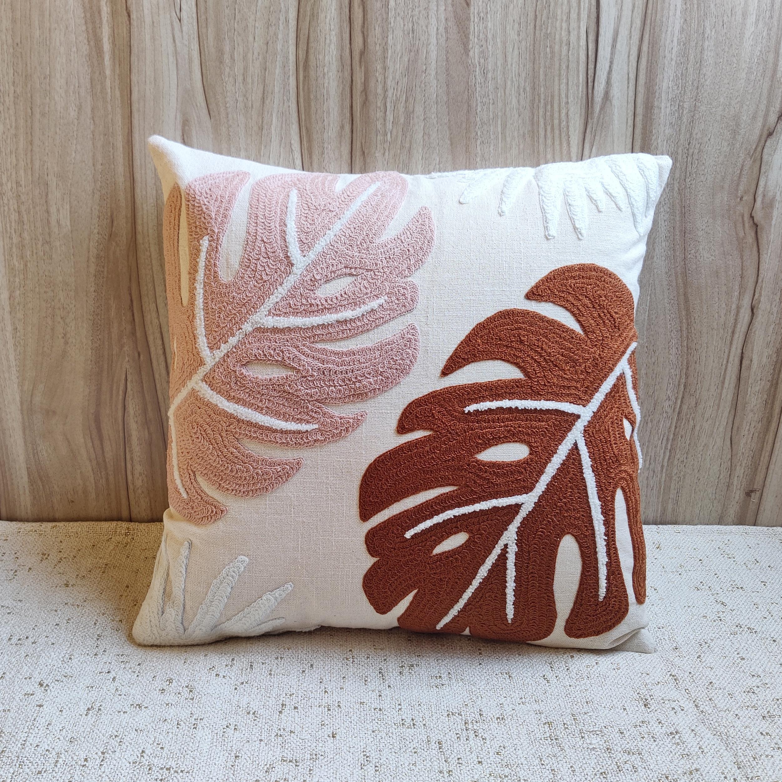 Bring the vibrant, textured beauty of the tropics into your home with this stunning hand-embroidered cotton cushion cover. This piece features bold, oversized Monstera leaves rendered in a contemporary color palette of rich terracotta/burnt orange and soft dusty rose/blush pink.
