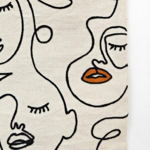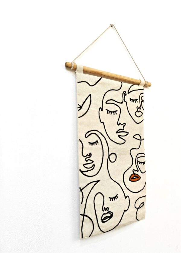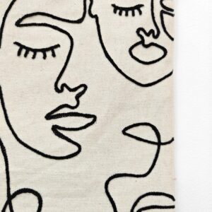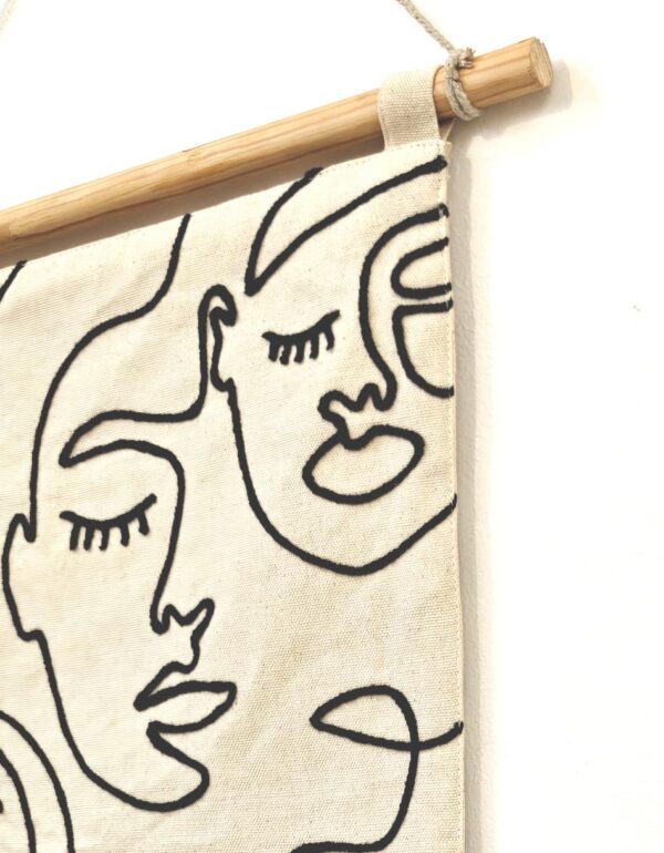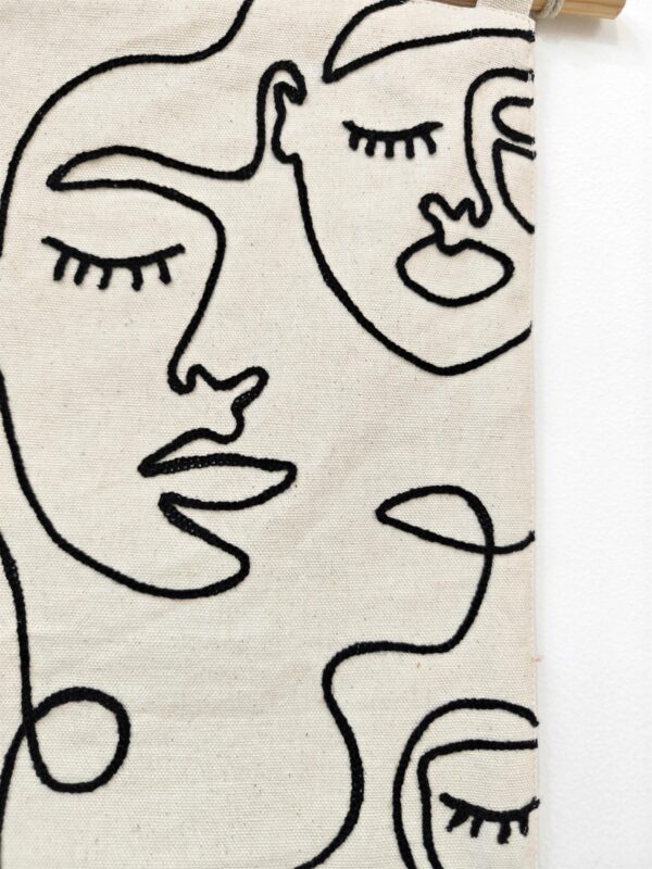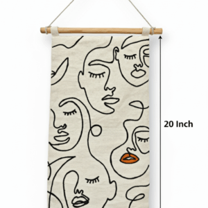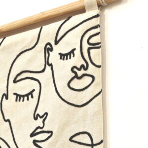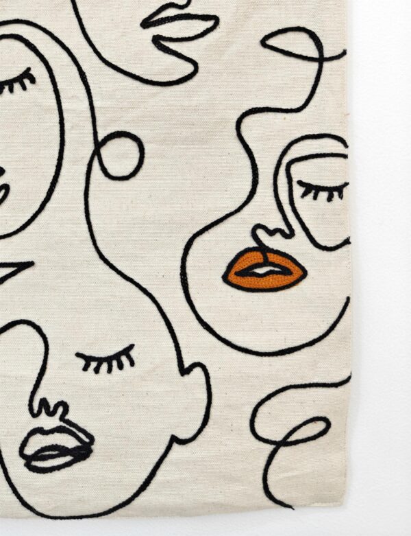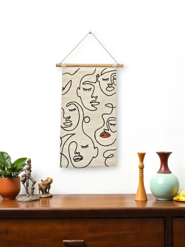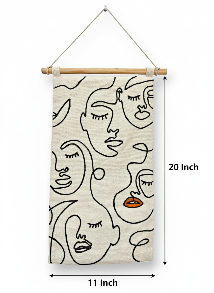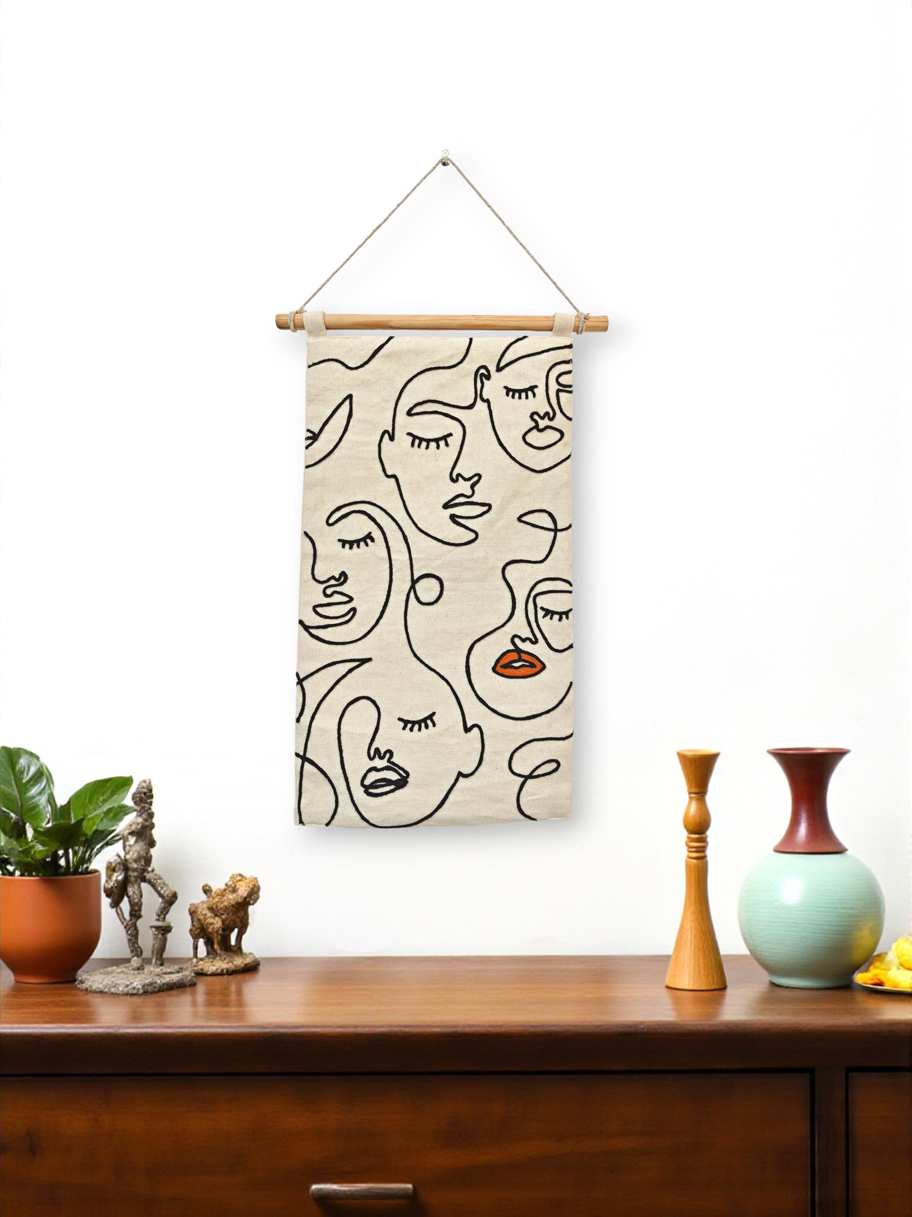 Elevate your interior with this captivating hand-embroidered cotton wall tapestry, a striking piece that blends contemporary art with artisanal texture. This tapestry features an intriguing, flowing composition of abstract faces rendered in a continuous single-line technique, creating a dynamic yet serene visual statement.