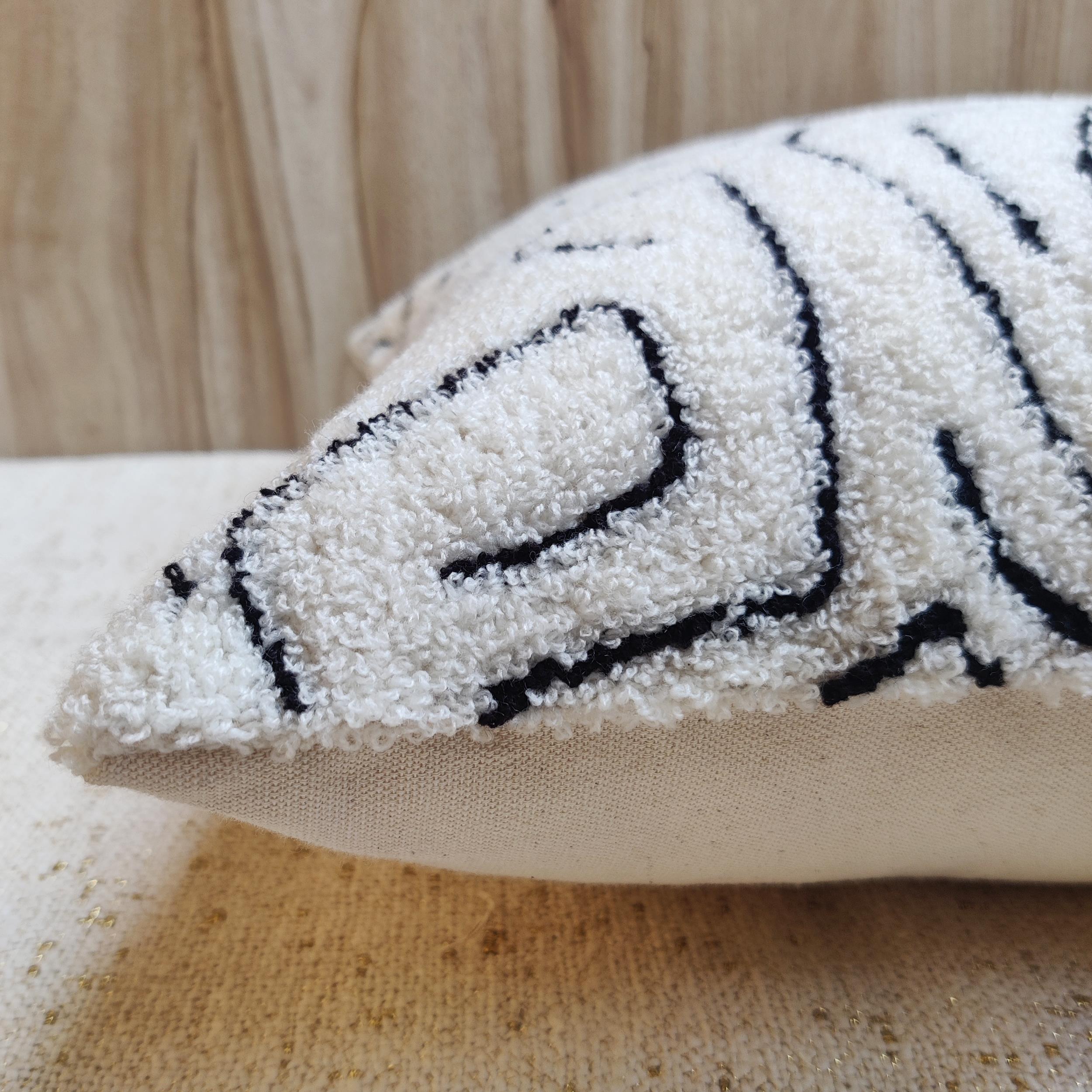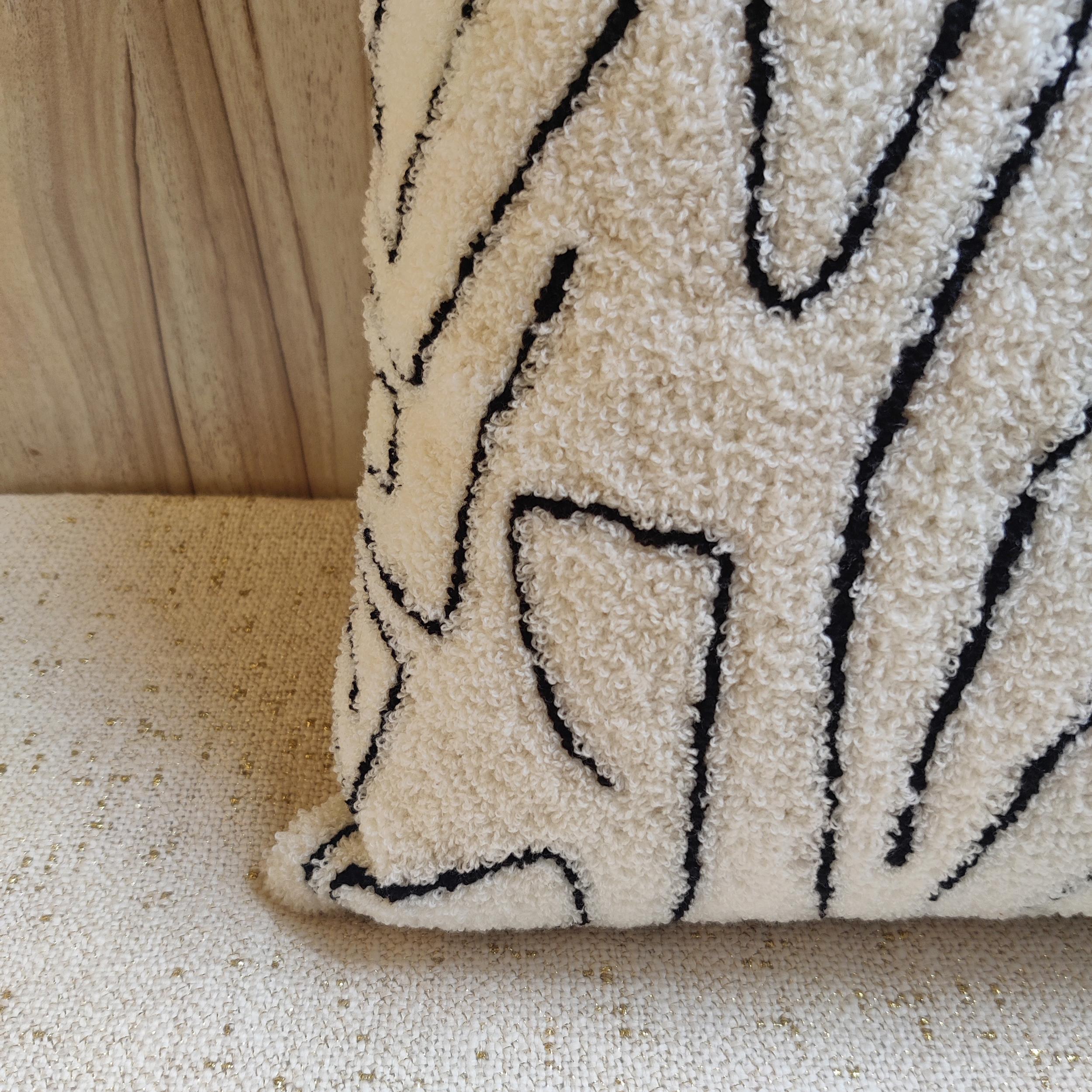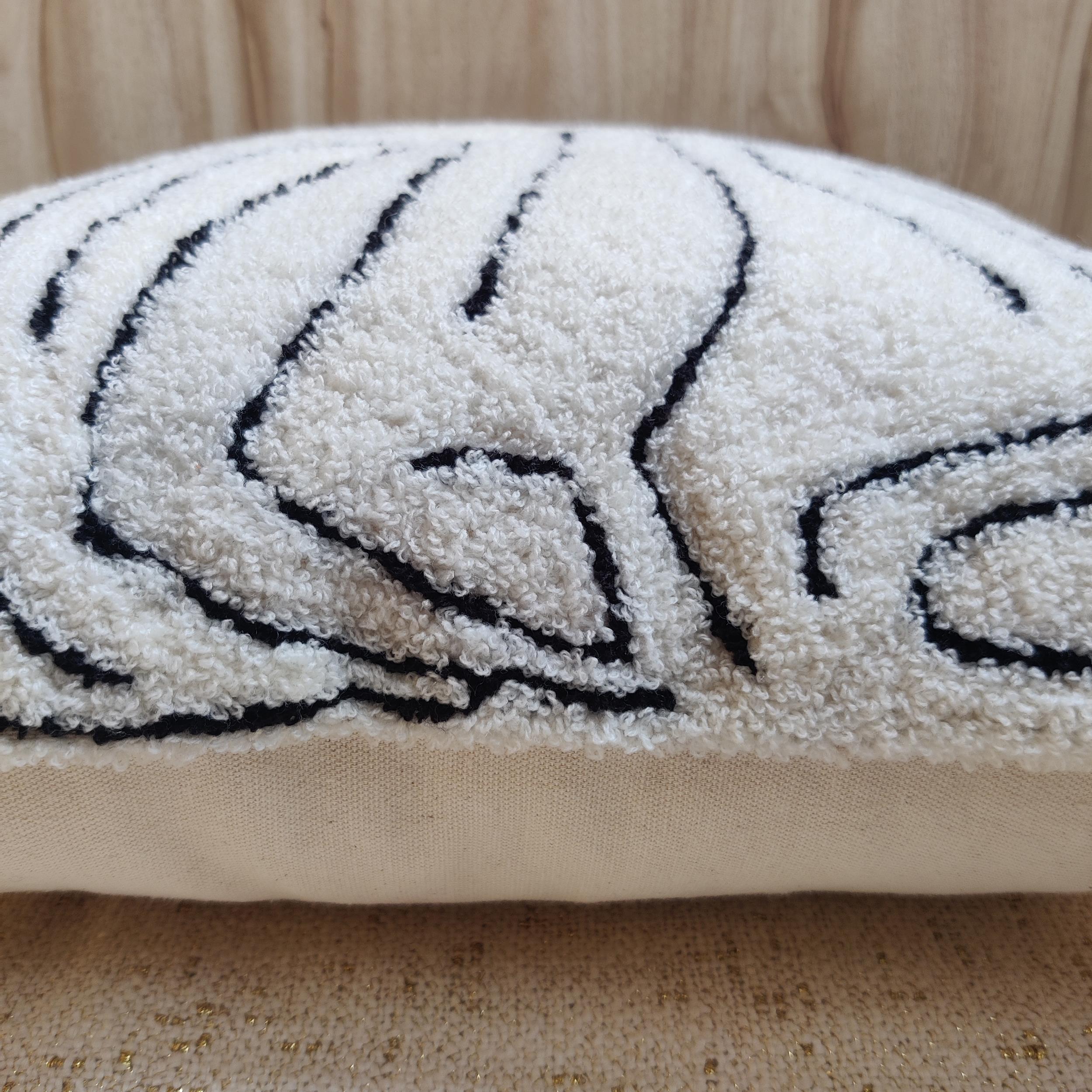 The cover starts with a creamy cotton fabric base, which serves as a canvas for the abstract, continuous line art. This intricate maze-like pattern is meticulously hand-embroidered with soft, black acrylic wool, utilizing a towel stitch loop technique to give the lines a wonderful, raised, fuzzy texture.