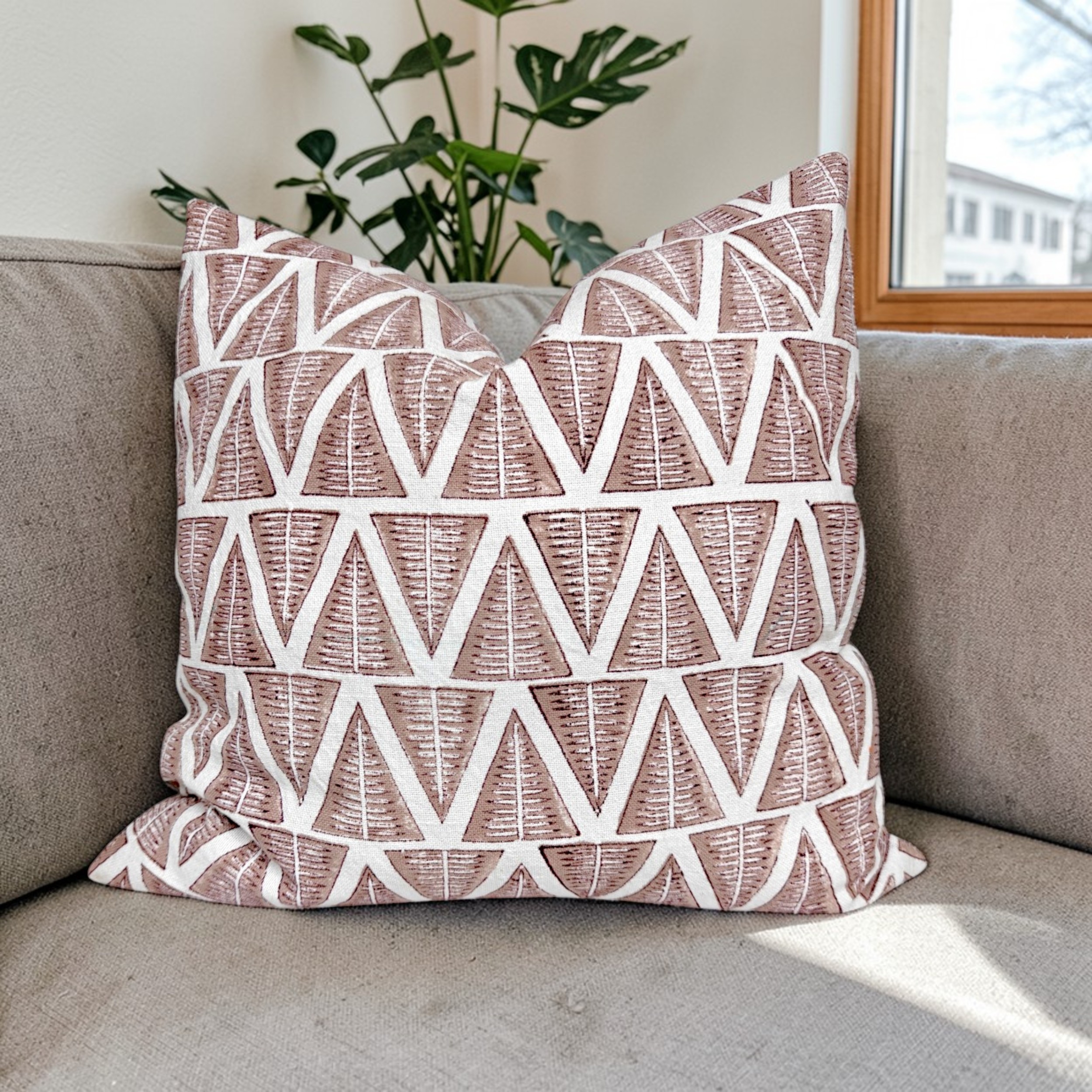 Add a touch of handcrafted elegance to your space with this beautiful block print cushion cover. Featuring a modern geometric triangle pattern in earthy tones, this piece blends traditional artistry with contemporary design.