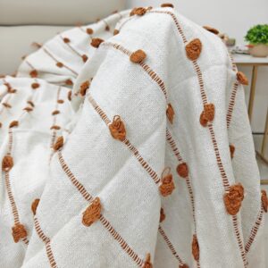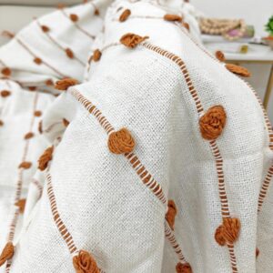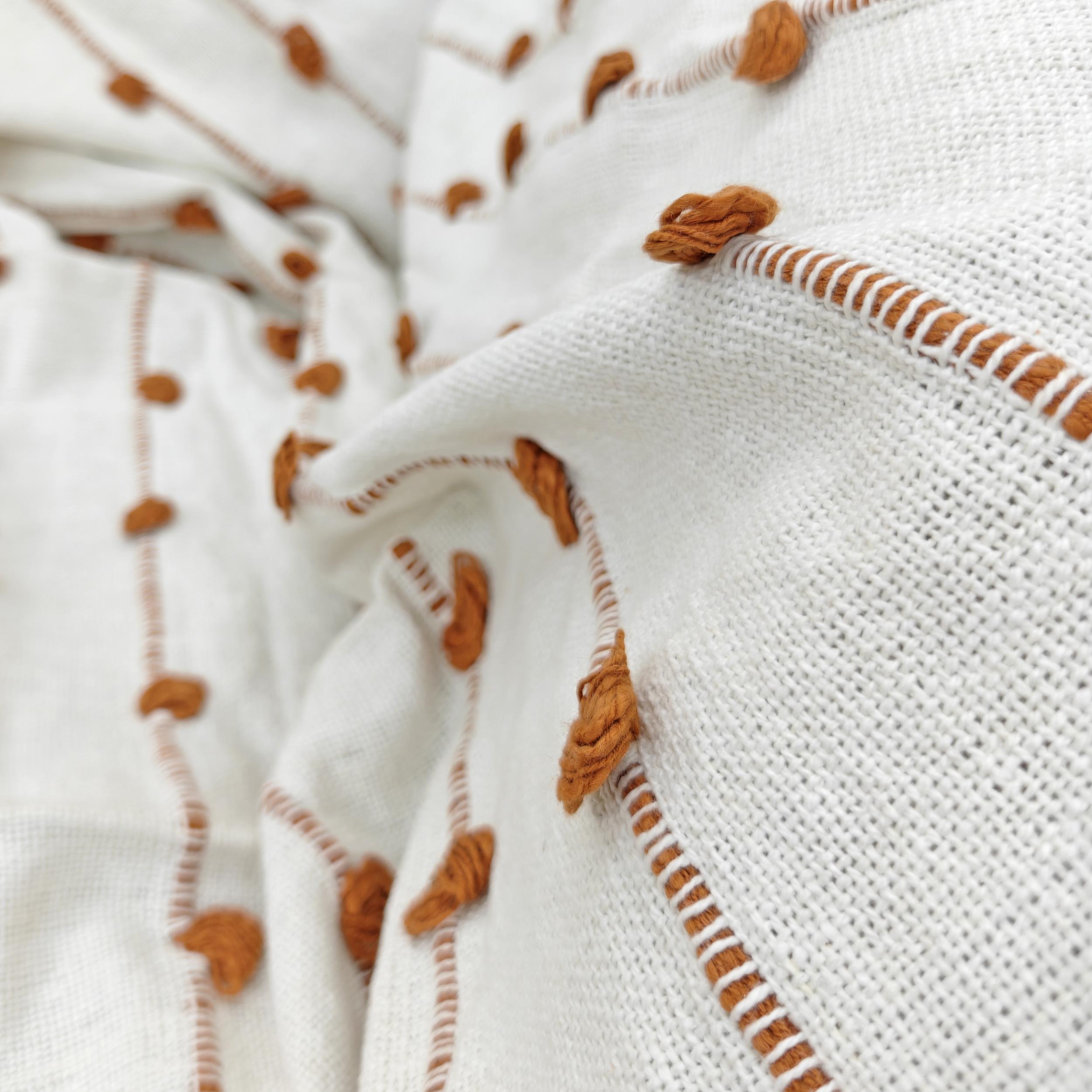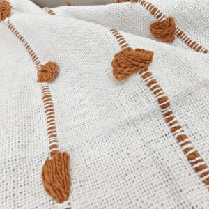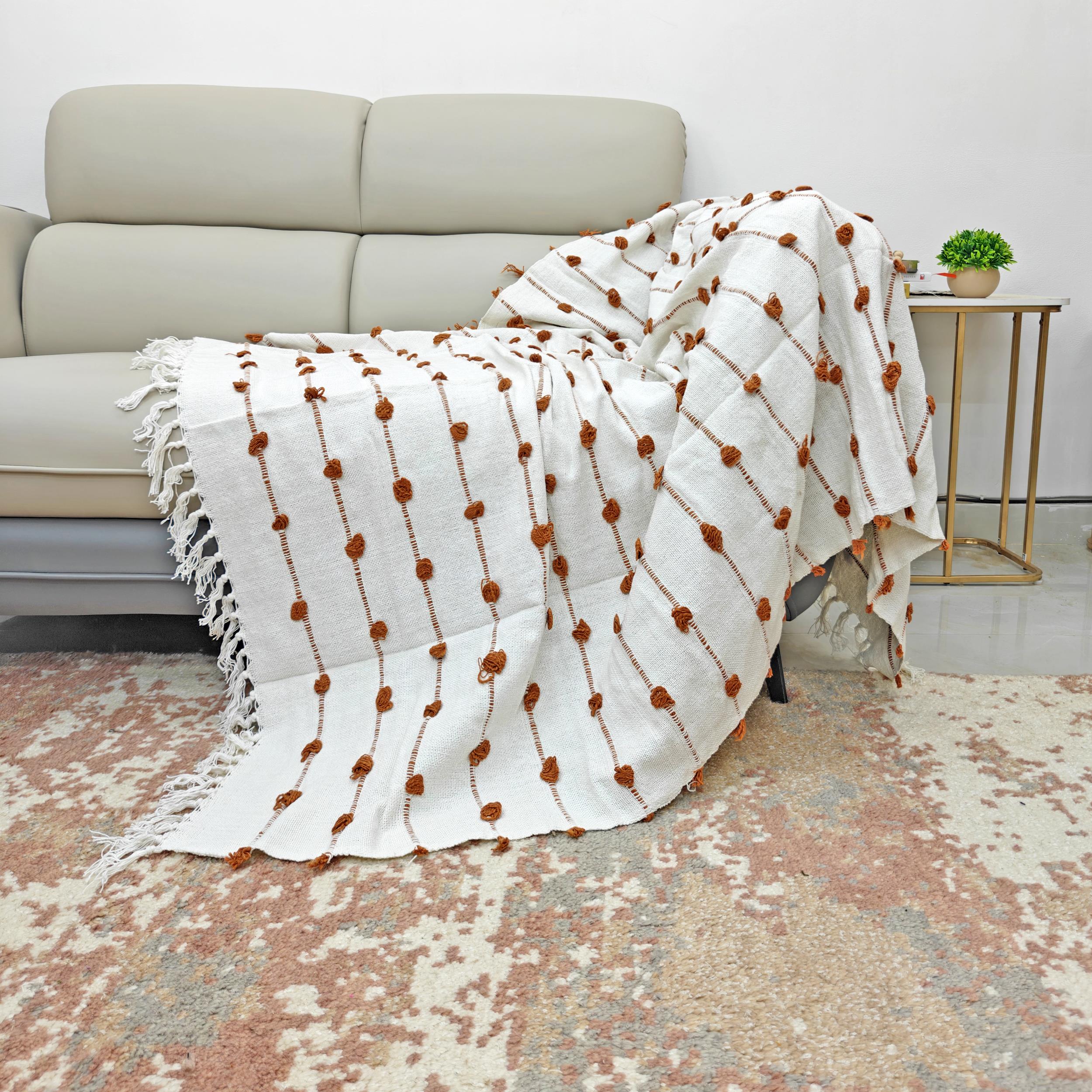 Introduce a warm, sophisticated pop of color and rich texture to your space with this Artisan Tufted Throw. The blanket features a crisp, natural ivory base fabric adorned with vertical rows of dimensional, hand-tufted dots in a beautiful Rust/Terracotta hue. This earthy accent color brings a cozy, global-inspired layer, making it an ideal statement piece for adding warmth and character to your sofa, chair, or bed.