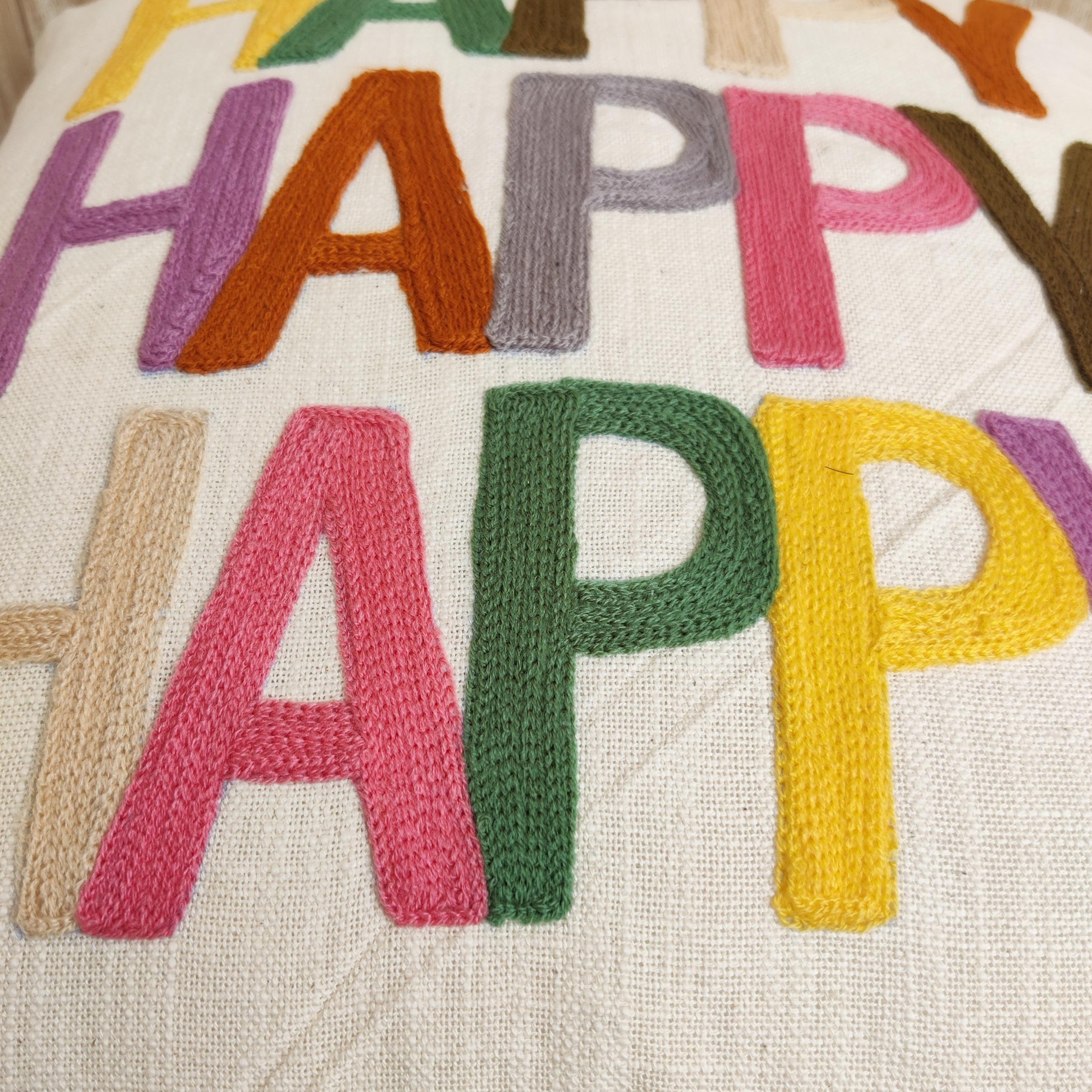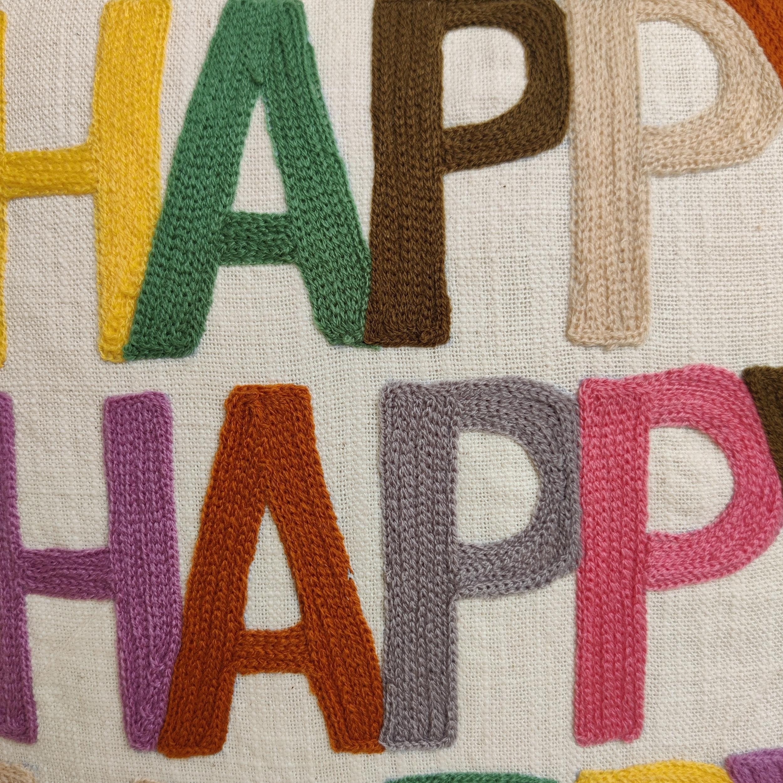 The base is a beautiful, naturally textured cotton slub fabric in a neutral cream hue, providing an organic backdrop. Across this canvas, the word “HAPPY” is repeated three times, rendered in bold, block letters through meticulous hand embroidery using soft acrylic wool.