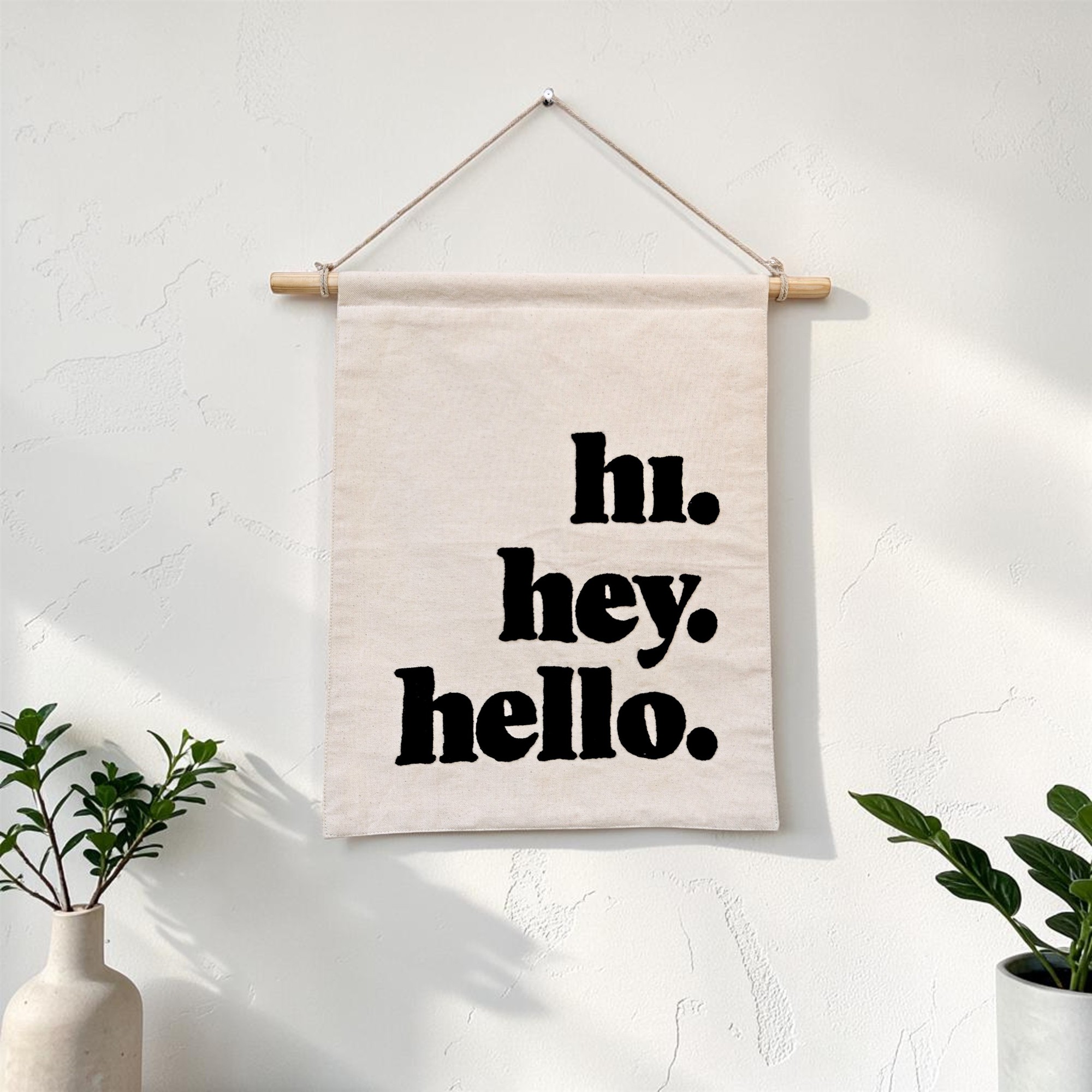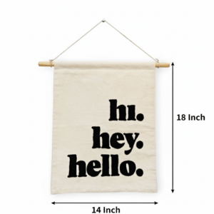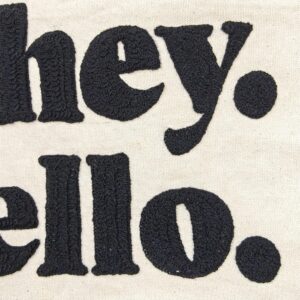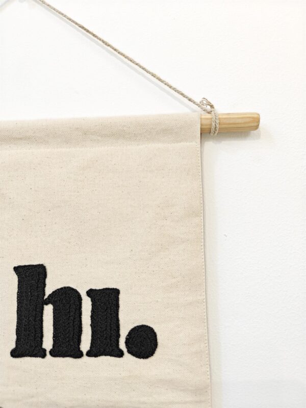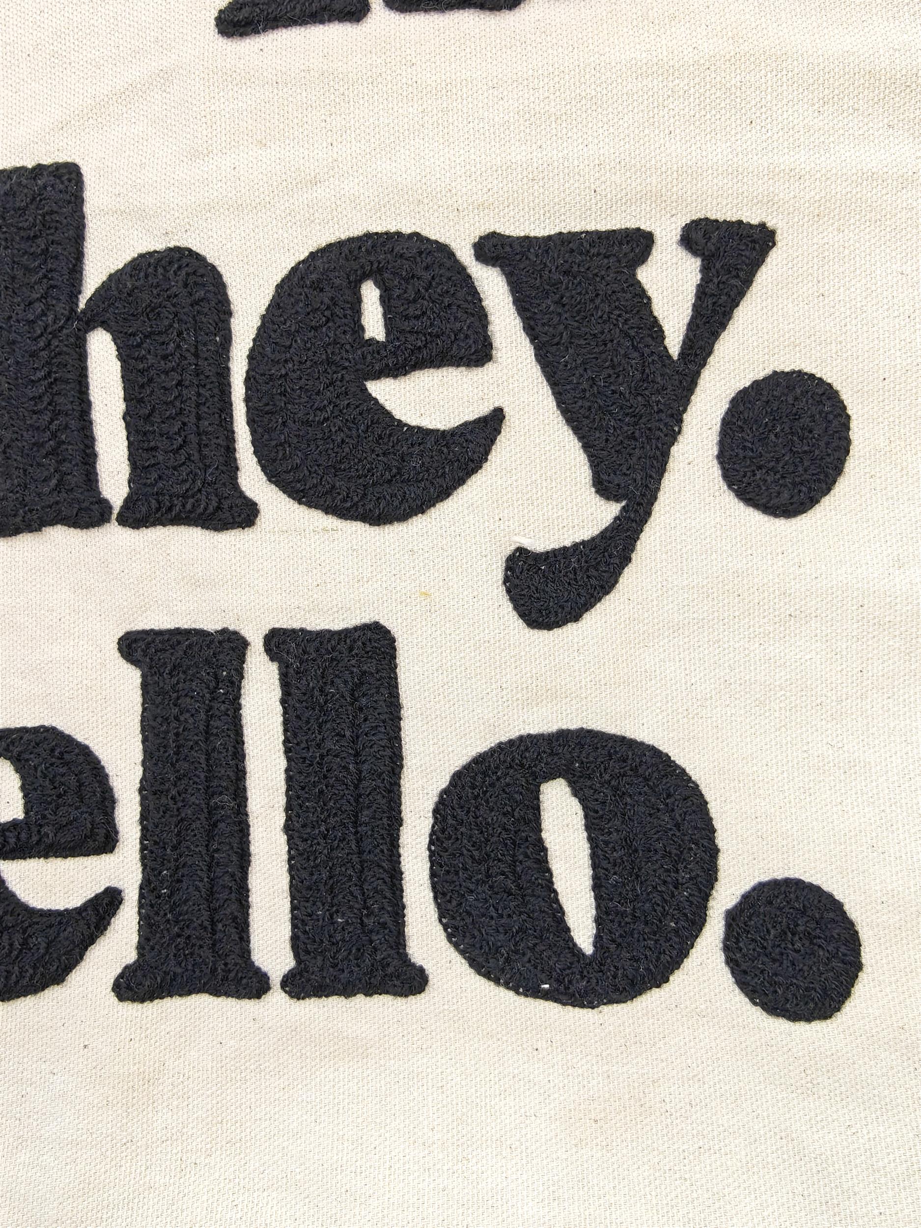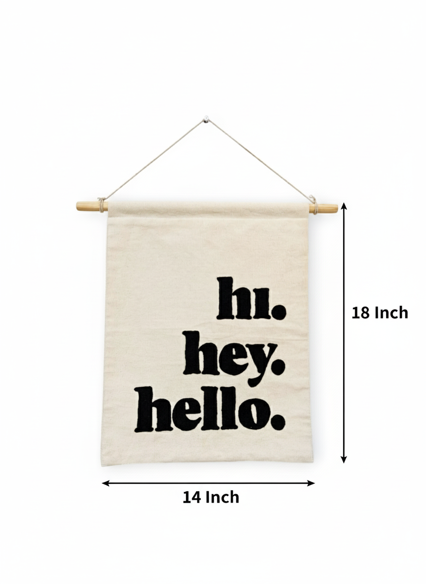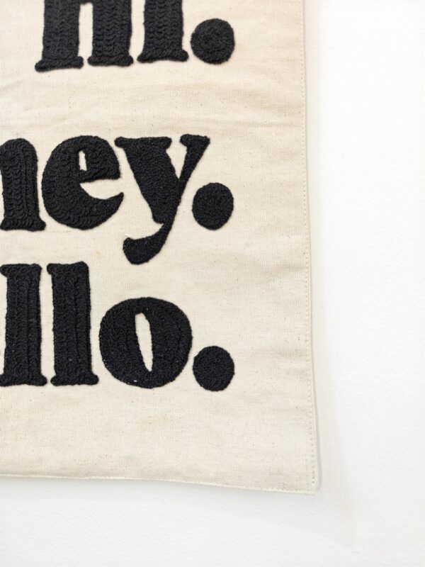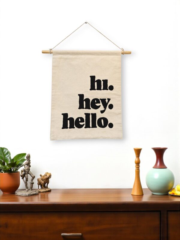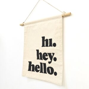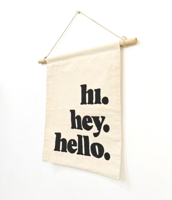 Greet your guests and your day with this charming hand-embroidered cotton wall tapestry! This simple, bold banner features the friendly messages: “hi. hey. hello.” stacked in a clean, modern, black font.