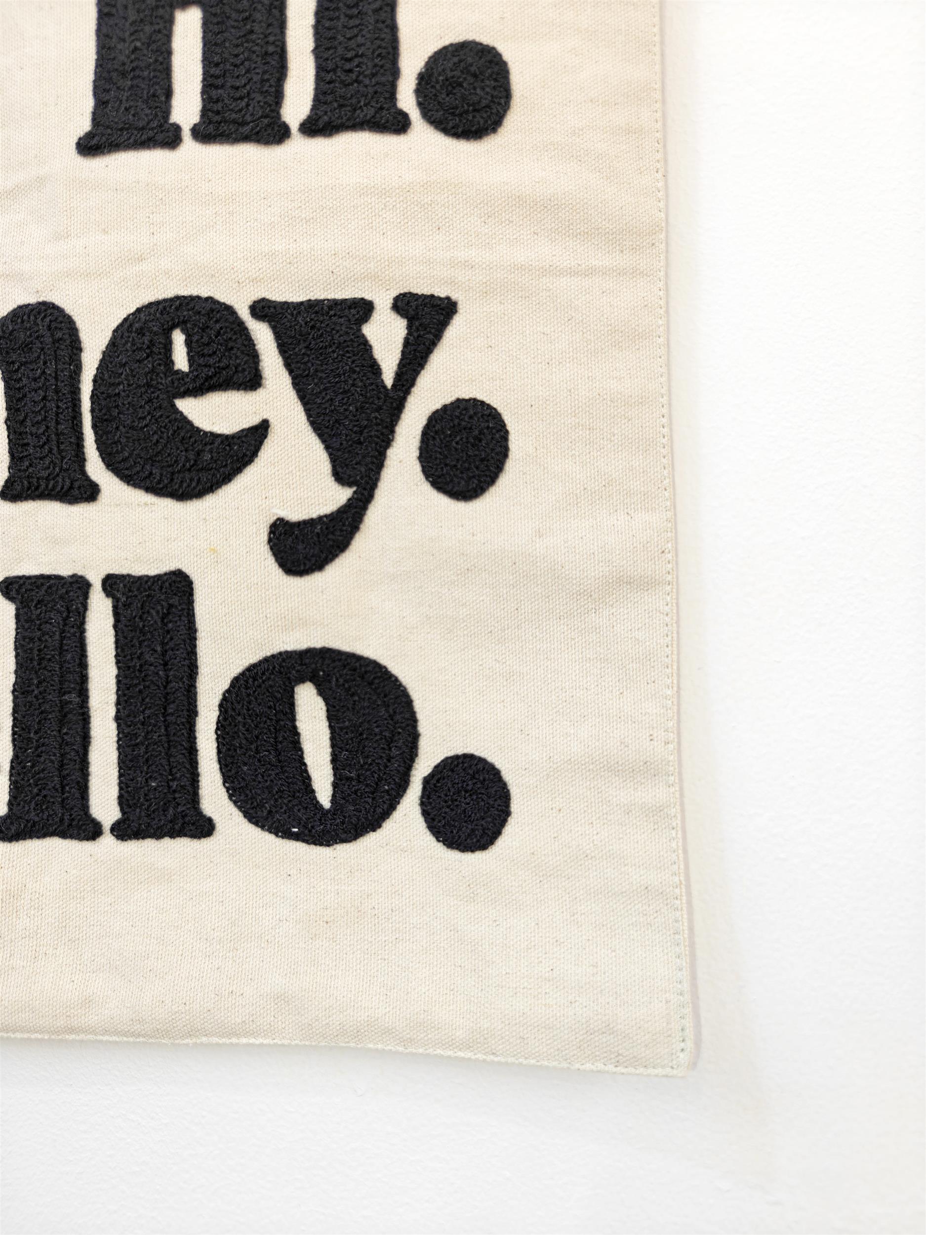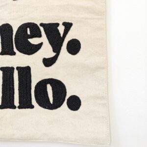 “Hi. Hey. Hello.” Hand-Embroidered Welcome Wall Banner