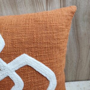 Inject a burst of warm color and artistic texture into your space with this stunning hand-embroidered cotton cushion cover. This piece is a modern statement, featuring bold, flowing, abstract white lines that suggest stylized script or calligraphy on a rich, textured terracotta or burnt orange fabric.
