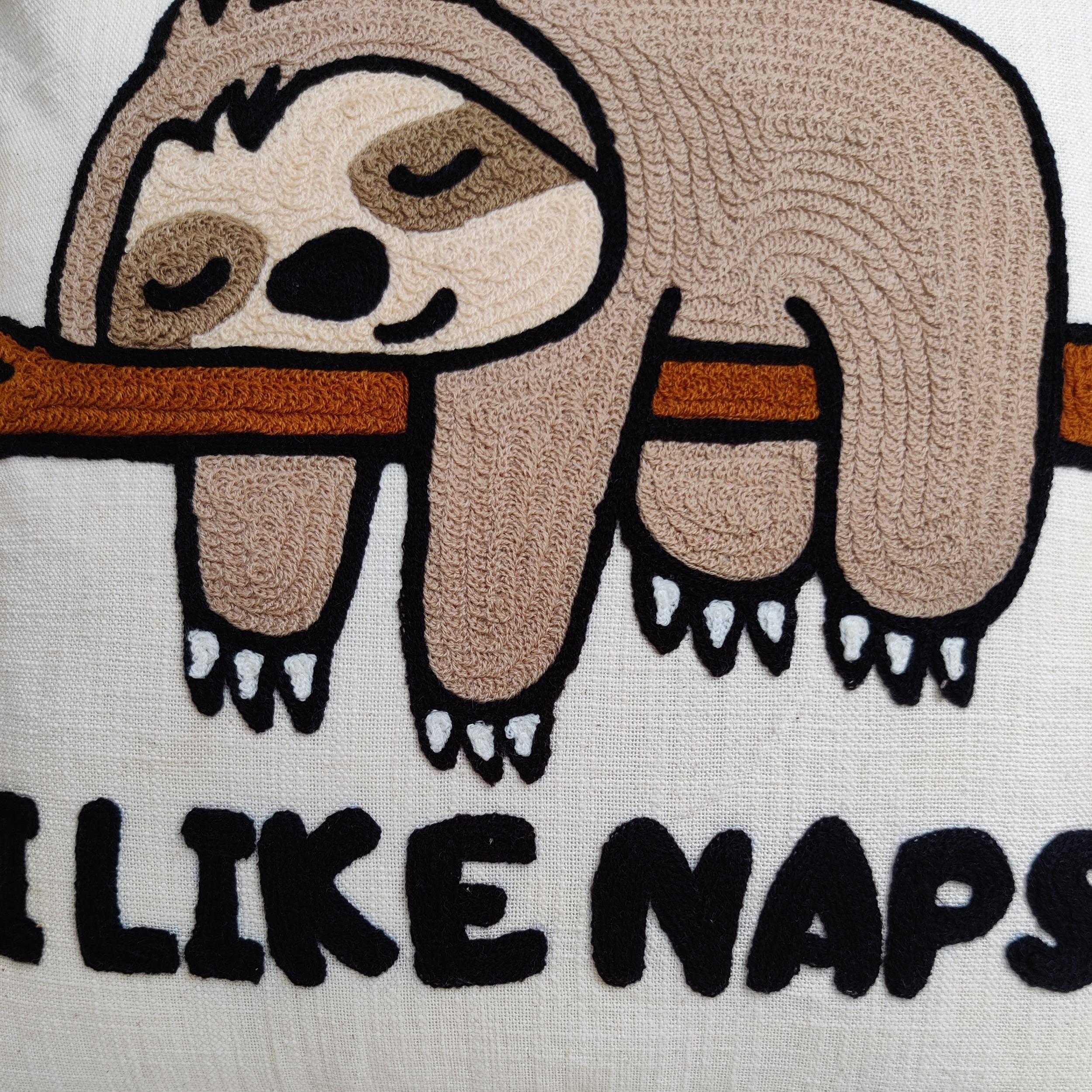 The cover features a beautifully textured natural cotton slub fabric base in a soft, cream hue. The design is brought to life by meticulous hand-embroidery using soft acrylic wool: a sleepy sloth is perched on a branch above the perfectly relatable phrase, “I LIKE NAPS”.