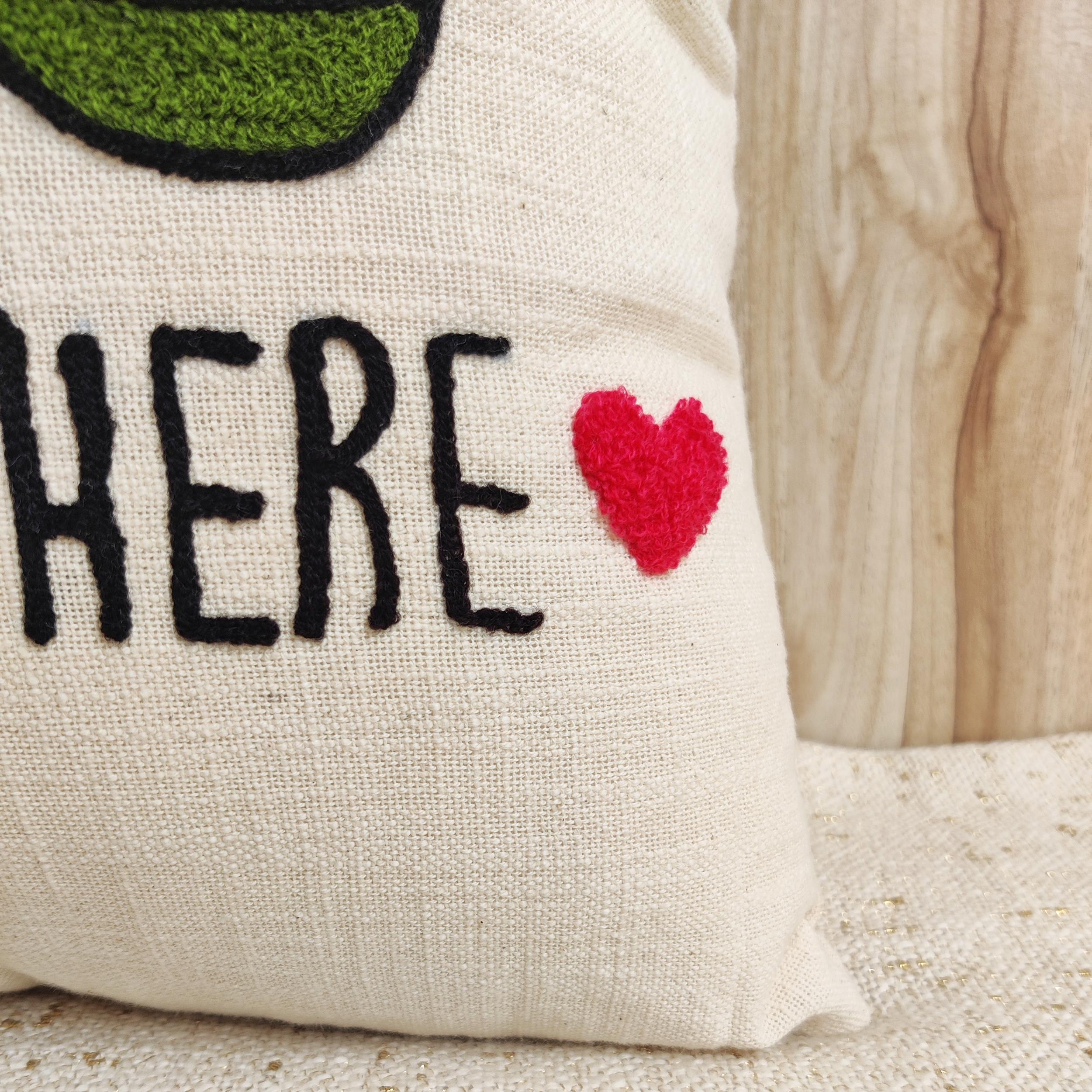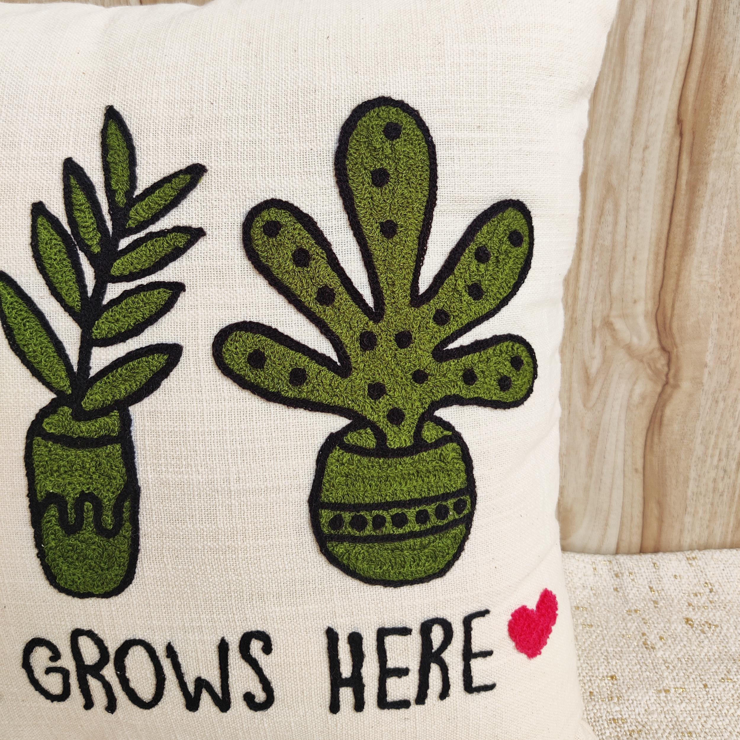 The base is crafted from textured natural cotton slub fabric, providing an authentic, homespun canvas in a versatile cream hue. The design features a charming trio of potted cacti and succulents, along with the heartwarming sentiment “LOVE GROWS HERE”—all intricately hand-embroidered with soft acrylic wool.