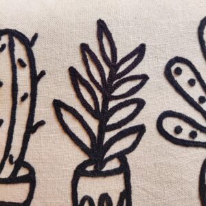 Cultivate a cozy and loving atmosphere in your home with this adorable hand-embroidered cotton cushion cover. Featuring a charming trio of potted cacti and succulents in bold black outline, the design is anchored by the heartwarming message: “LOVE GROWS HERE ❤️”
