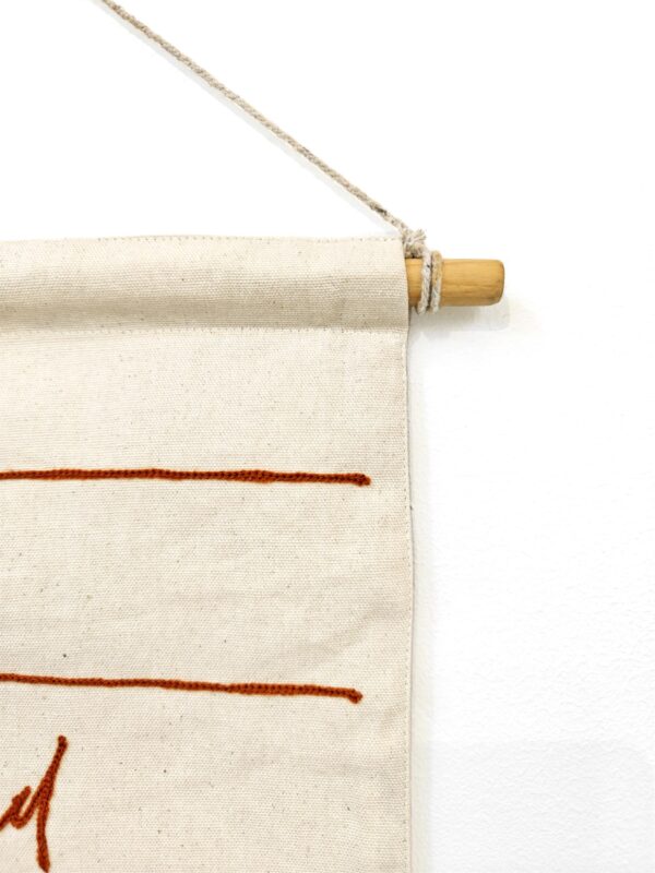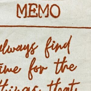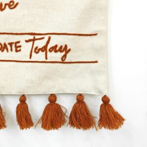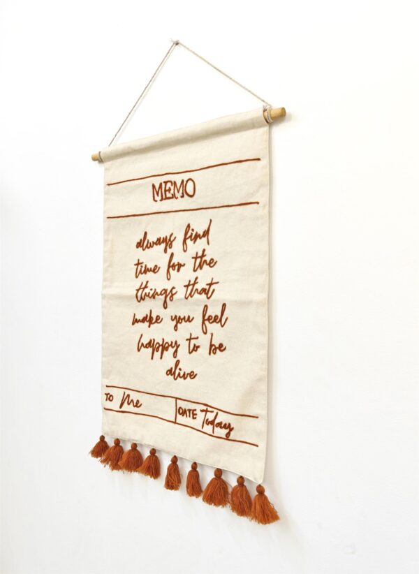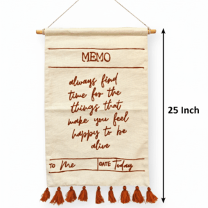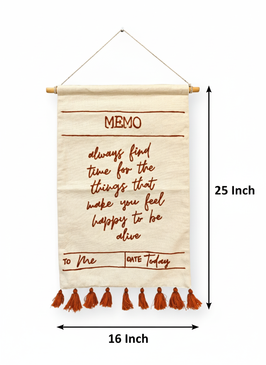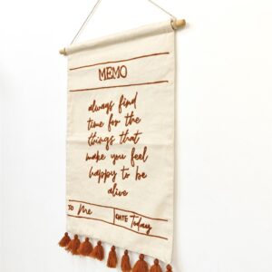 Add a warm, artisan touch to your décor with this charming hand-embroidered cotton wall tapestry. Styled as a classic memo pad, this piece features a heartfelt and inspiring message in a beautiful, flowing script, all rendered in a rich, earthy terracotta color.