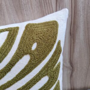 Bring a piece of lush, tropical elegance into your home with this magnificent hand-embroidered cotton cushion cover. Featuring a single, oversized Monstera deliciosa leaf in a rich, textured olive green, this piece is a bold celebration of botanical beauty.