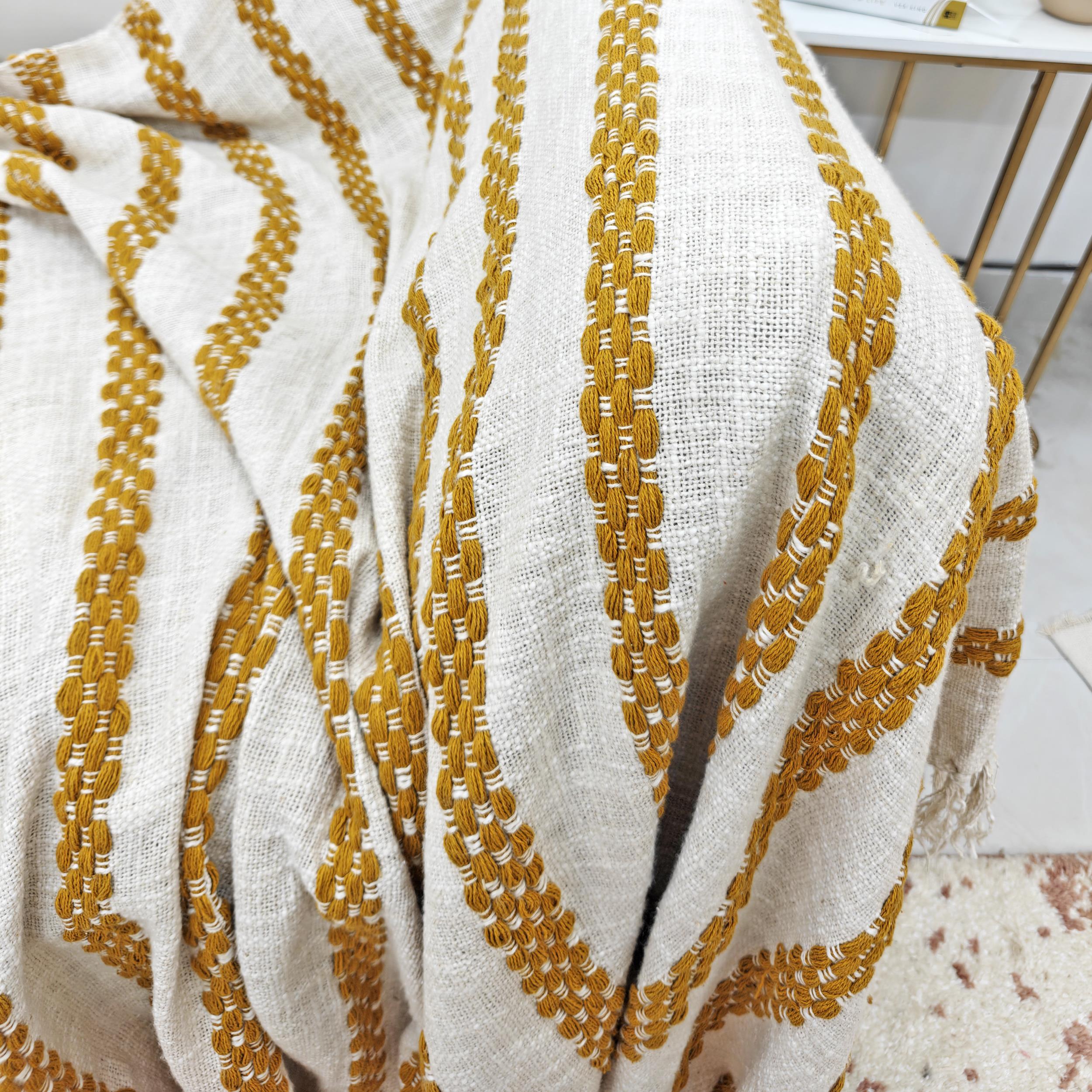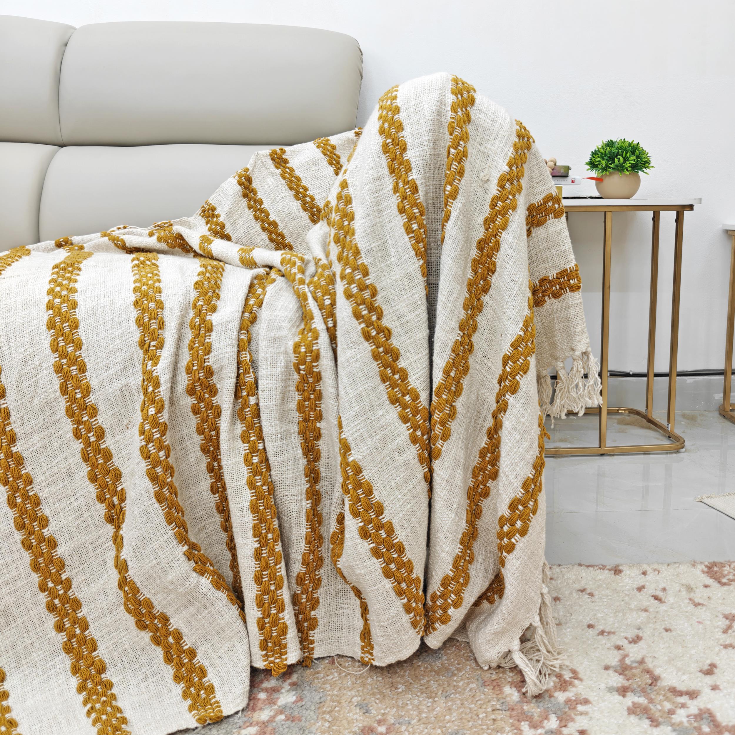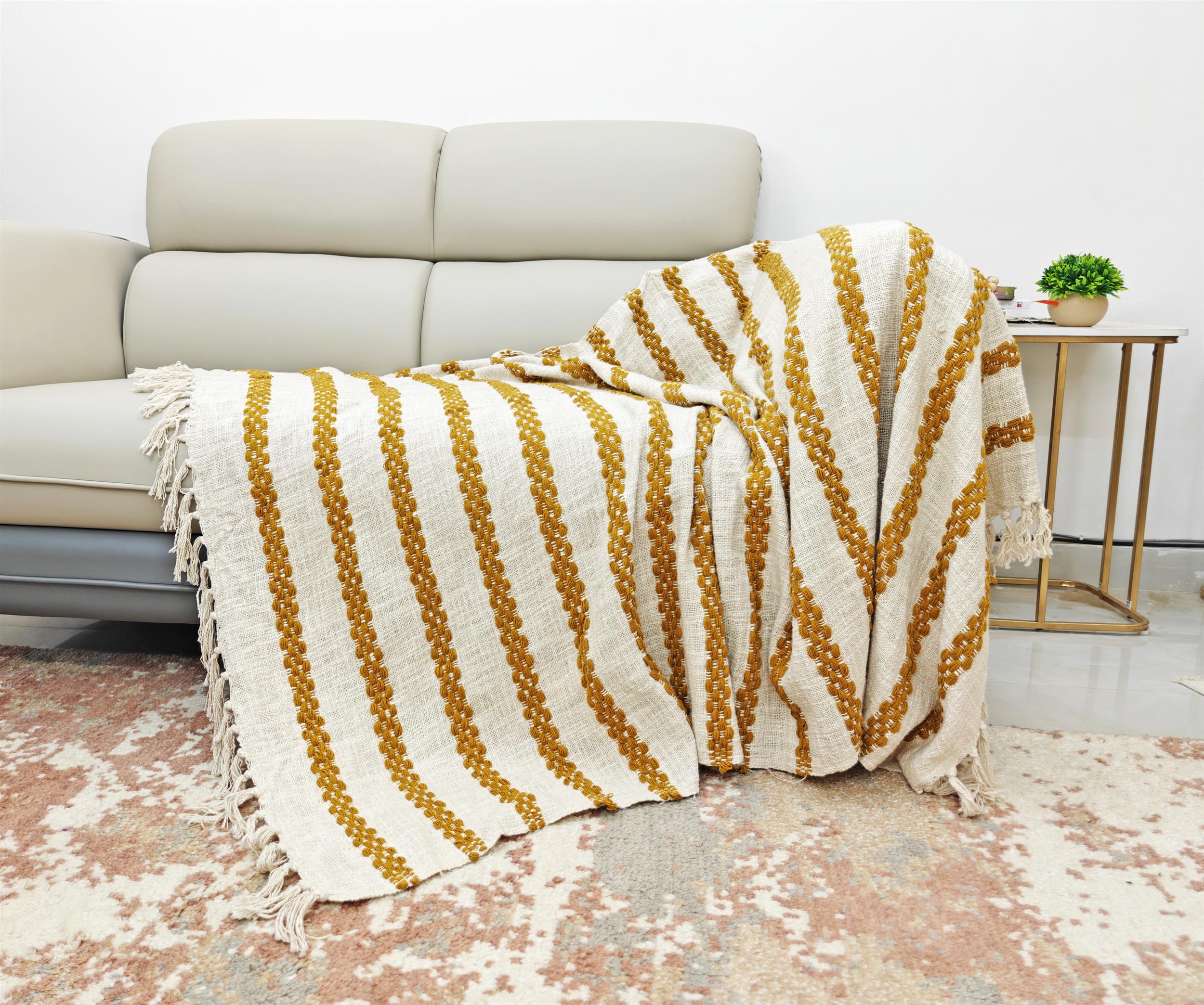 Brighten your home with the cheerful color and rich texture of the Solstice Dot Throw. This blanket features a crisp, neutral ivory base adorned with vertical rows of dimensional, hand-tufted dots (or pom-poms) in a vibrant Mustard Gold hue. This sunny accent color creates a striking visual and tactile contrast, making it the perfect piece to add cozy, Boho-Chic style and a warm focal point to your sofa, reading chair, or bed.