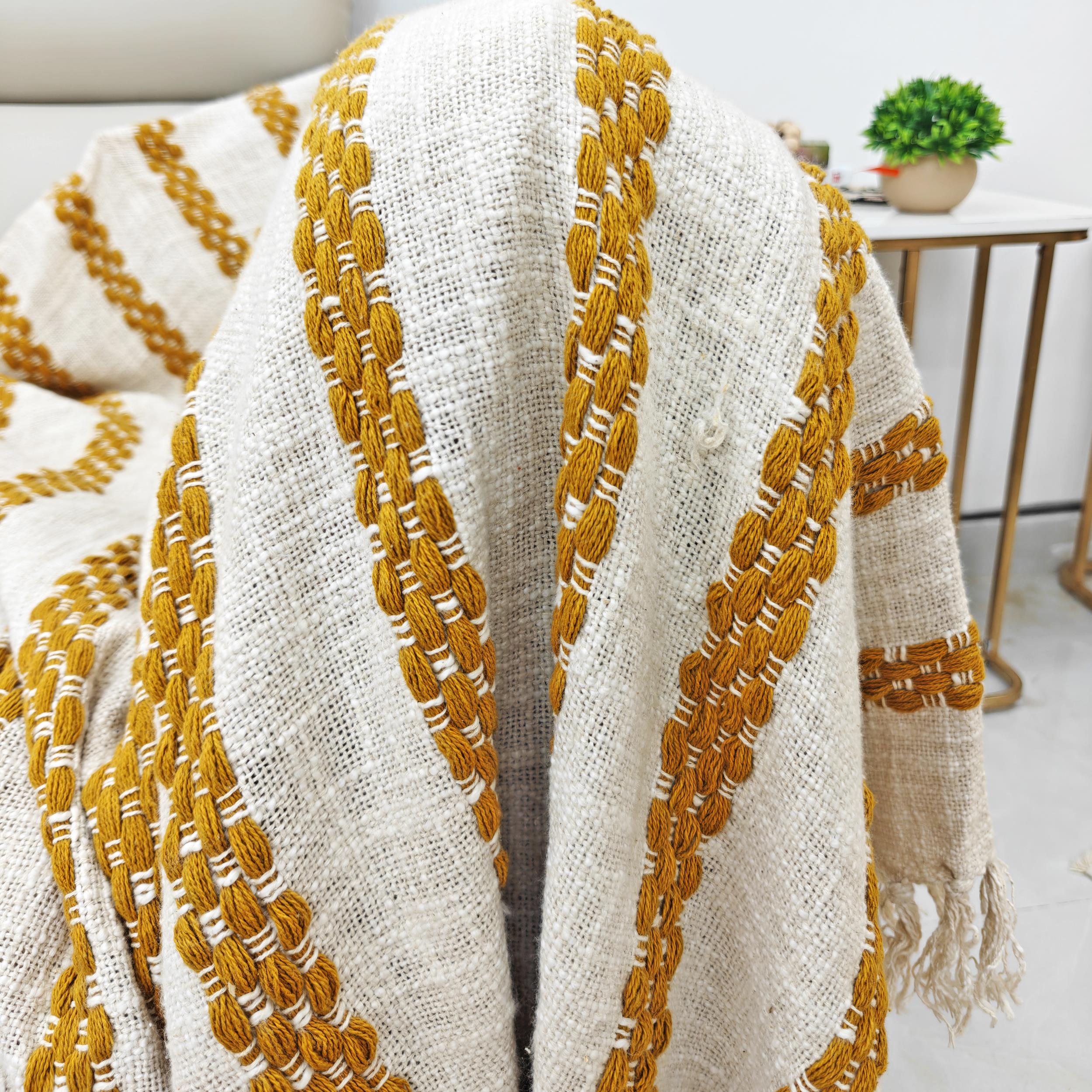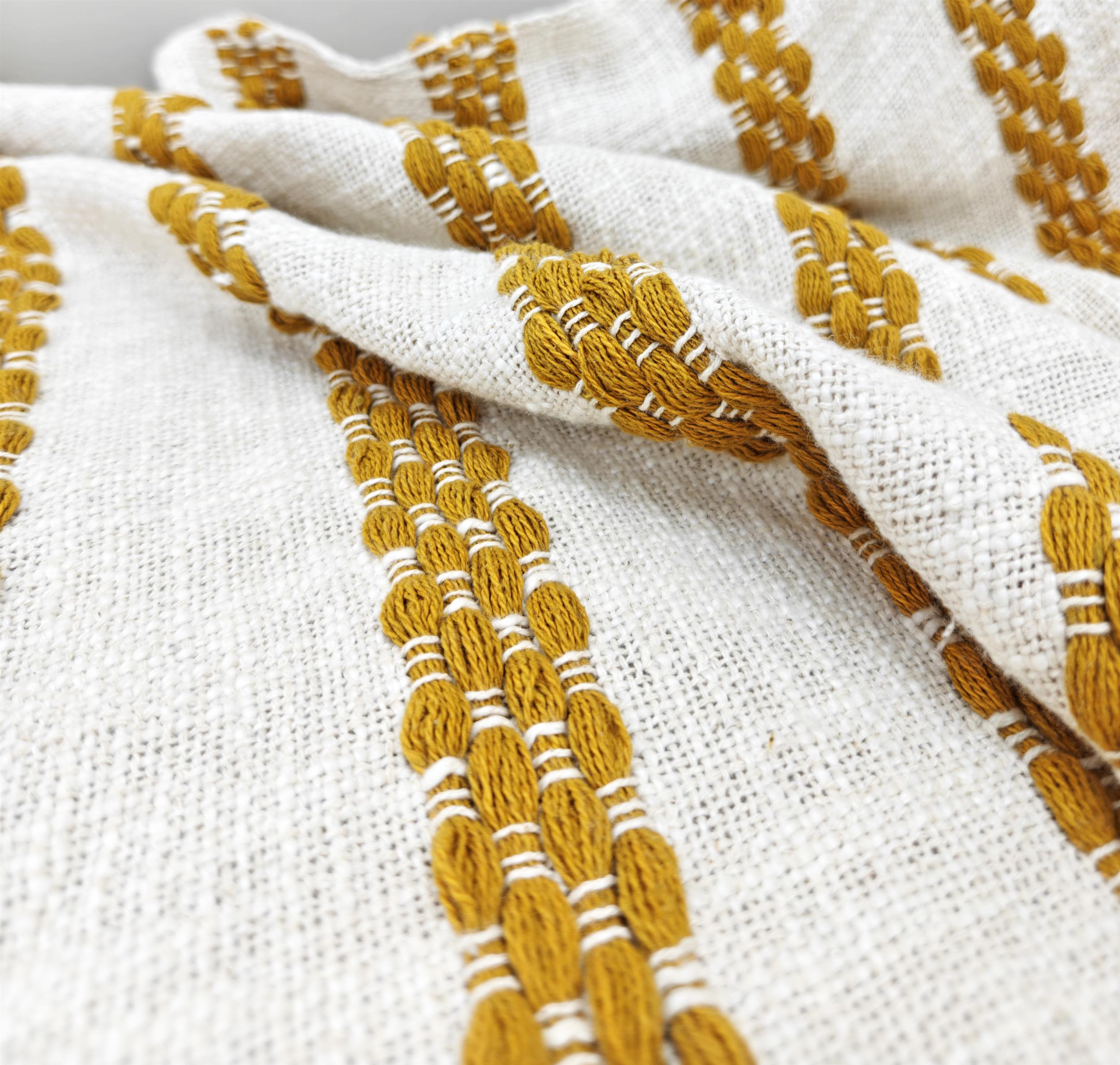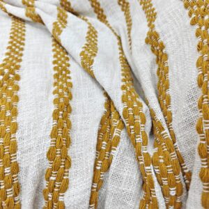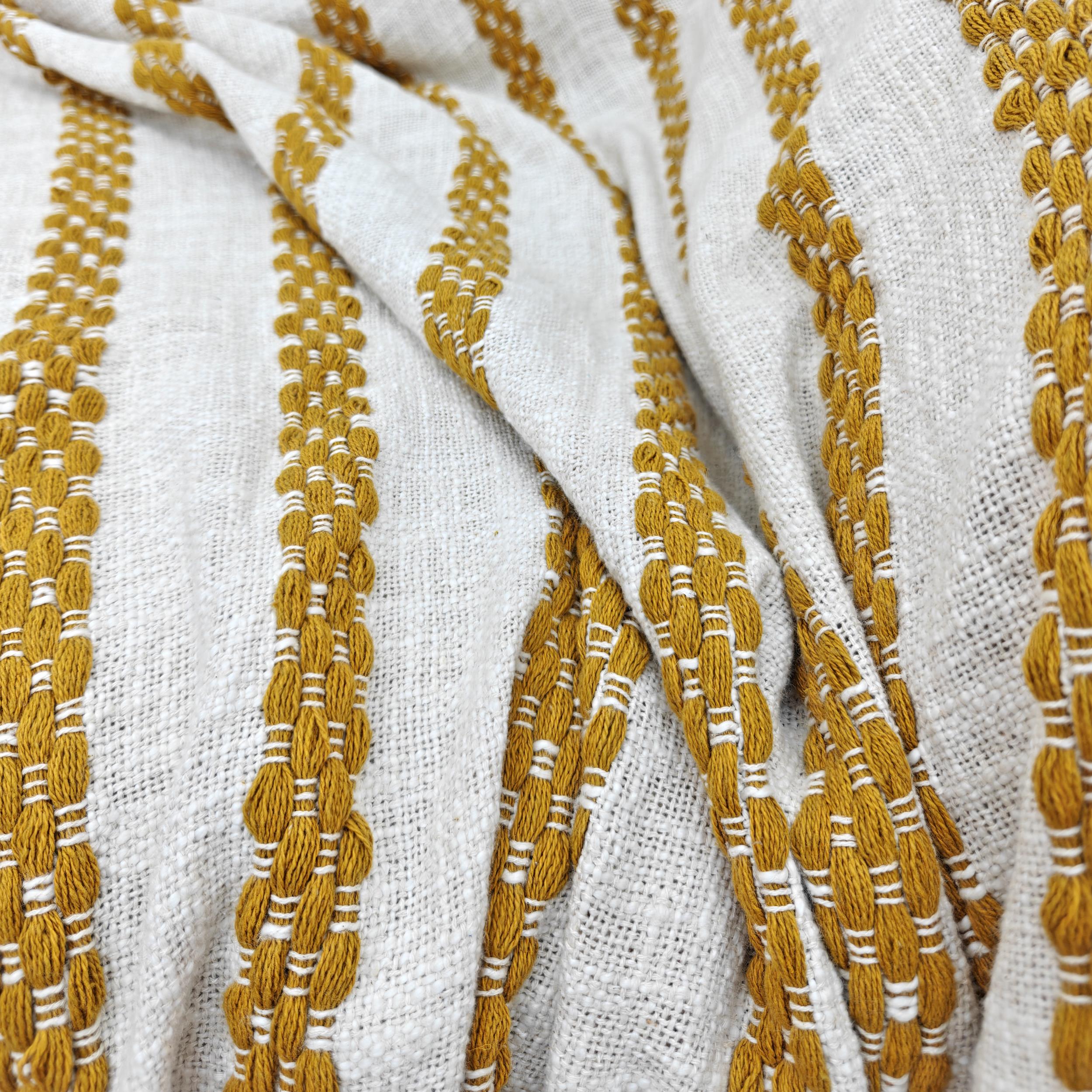 Brighten your home with the cheerful color and rich texture of the Solstice Dot Throw. This blanket features a crisp, neutral ivory base adorned with vertical rows of dimensional, hand-tufted dots (or pom-poms) in a vibrant Mustard Gold hue. This sunny accent color creates a striking visual and tactile contrast, making it the perfect piece to add cozy, Boho-Chic style and a warm focal point to your sofa, reading chair, or bed.