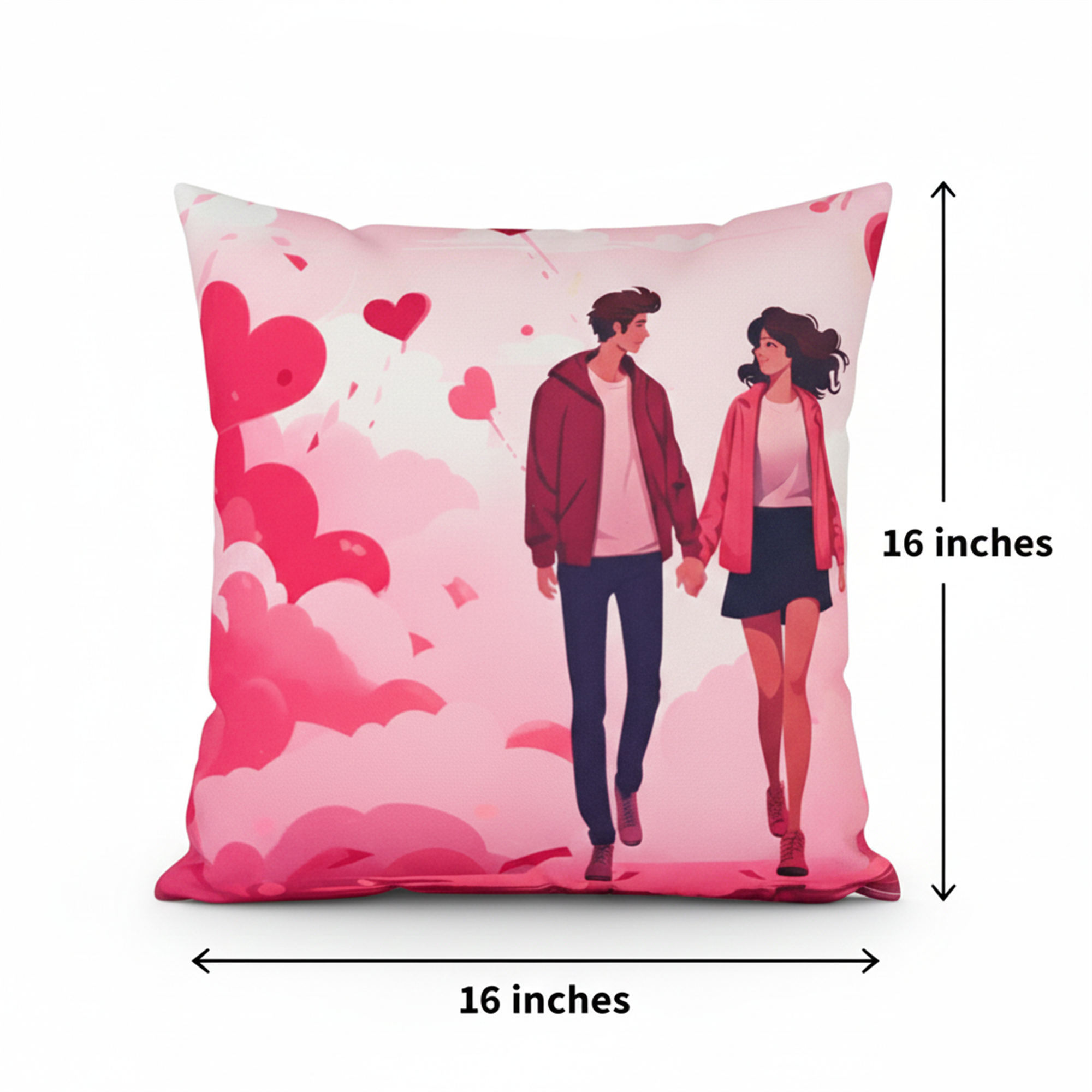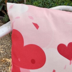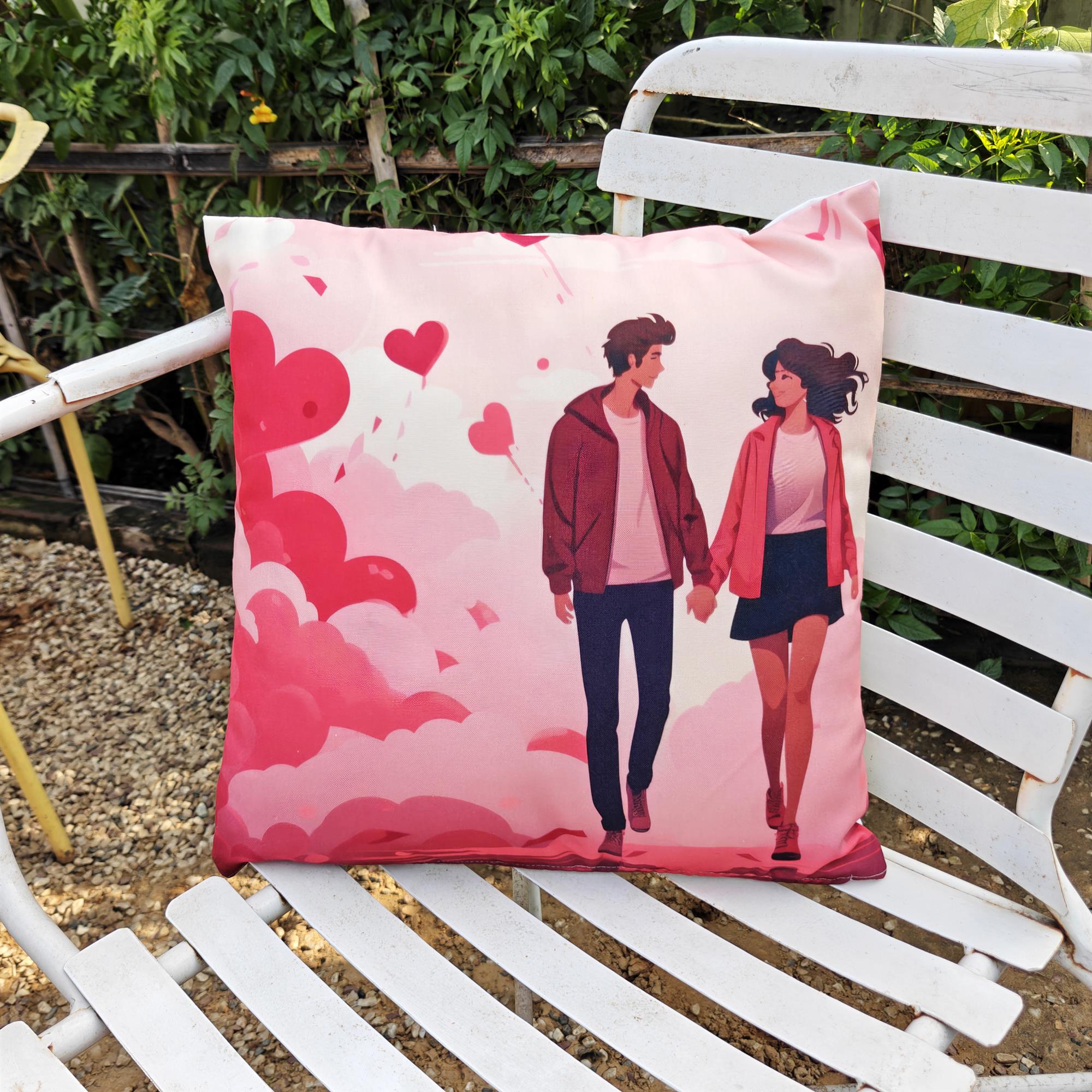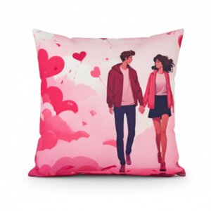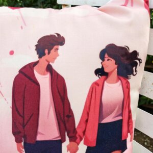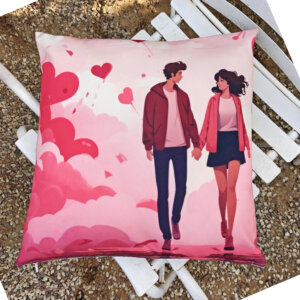 This cushion cover features a romantic couple with heart patterns in soft pink tones. The clean, modern print adds a warm and loving touch to sofas, beds, chairs, or lounge spaces.